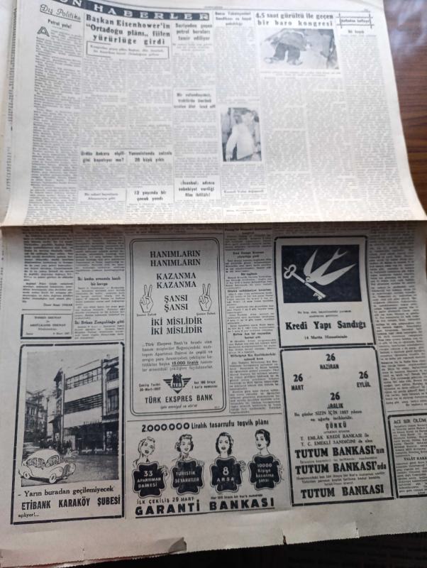 Cumhuriyet Gazetesi - 10 Mart 1957 - Adnan Menderes'in Ortadoğu Durumu İçin Demeci - İran Veliahdı Abdülillah Dün Tahran'a Gitti - Sivas Tankerinde Ortaya Çıkarılan Afyon Kaçakçılığı - Bize Karşı Rus Yunan Müşterek Kampanyası - İsmet İnönü Dün Sabah İzmir'e Harekete Geçti - Türk Ordusunun İlk Kadın Doktor Subayı Ülkü Sema Aran- Vatikan Ve Biz Yazan Numan Menemencioğlu Köşe Yazısı - İdam Sehpasında Can Veren Devletliler Yazan Cemalettin Saraçoğlu Yazı Dizisi - Kırkıncı Oda Yazan Peride Celal Yazı Dizisi - Amerikan Başkanı Eisenhower'in Ortadoğu Planı Fiilen Yürürlüğe Girdi - Dram Tiyatrosunun Büfecisi Stelyo Vefat Etti - Turing Ve Otomobil Kurumunun Kongresi - Haftanın Şakaları Yazan Burhan Felek - Hint Güneşi Şehzadebaşı ve Çemberlitaş Sinemasında - Namus Borcu Filmi Atlas Sinemasında - Resimli Romanımız Mormon Mezhebi Ve Kurucusunun Dramı - Fenerbahçe Bugün Vefa İle Karşılaşıyor - Beykoz Beşiktaş'ı Farkla Yendi - Ömer Besim Krosu Bugün Yapılıyor - Göztepe Ujpesti 2 1 Yendi- Muhabank, Yunus Nadi tarafından kaleme alınmıştır. Cumhuriyet Gazetesi - 10 Mart 1957 - Adnan Menderes'in Ortadoğu Durumu İçin Demeci - İran Veliahdı Abdülillah Dün Tahran'a Gitti - Sivas Tankerinde Ortaya Çıkarılan Afyon Kaçakçılığı - Bize Karşı Rus Yunan Müşterek Kampanyası - İsmet İnönü Dün Sabah İzmir'e Harekete Geçti - Türk Ordusunun İlk Kadın Doktor Subayı Ülkü Sema Aran- Vatikan Ve Biz Yazan Numan Menemencioğlu Köşe Yazısı - İdam Sehpasında Can Veren Devletliler Yazan Cemalettin Saraçoğlu Yazı Dizisi - Kırkıncı Oda Yazan Peride Celal Yazı Dizisi - Amerikan Başkanı Eisenhower'in Ortadoğu Planı Fiilen Yürürlüğe Girdi - Dram Tiyatrosunun Büfecisi Stelyo Vefat Etti - Turing Ve Otomobil Kurumunun Kongresi - Haftanın Şakaları Yazan Burhan Felek - Hint Güneşi Şehzadebaşı ve Çemberlitaş Sinemasında - Namus Borcu Filmi Atlas Sinemasında - Resimli Romanımız Mormon Mezhebi Ve Kurucusunun Dramı - Fenerbahçe Bugün Vefa İle Karşılaşıyor - Beykoz Beşiktaş'ı Farkla Yendi - Ömer Besim Krosu Bugün Yapılıyor - Göztepe Ujpesti 2 1 Yendi- Muhabank adlı eser Türkçe dilindedir.