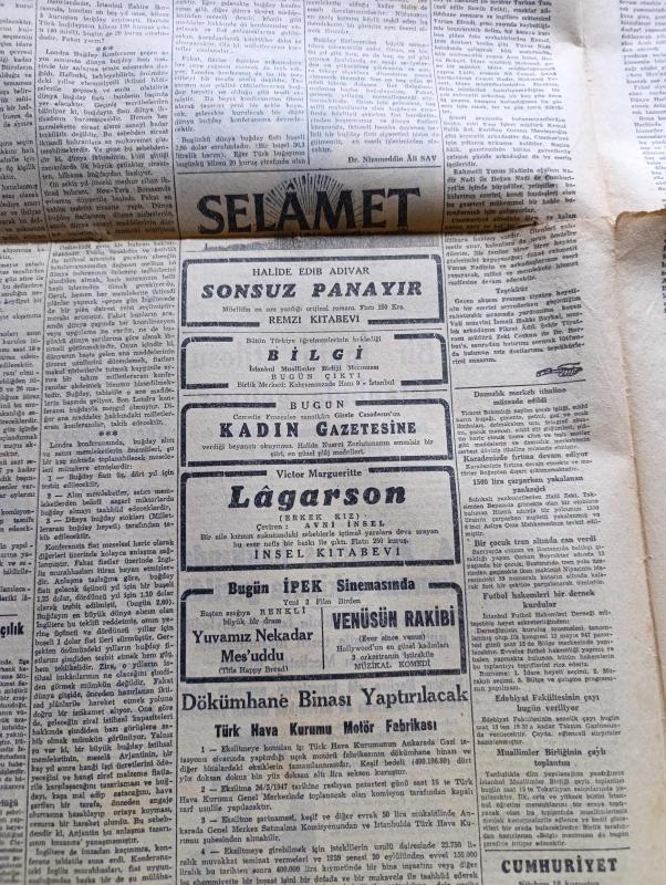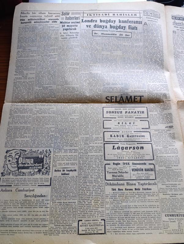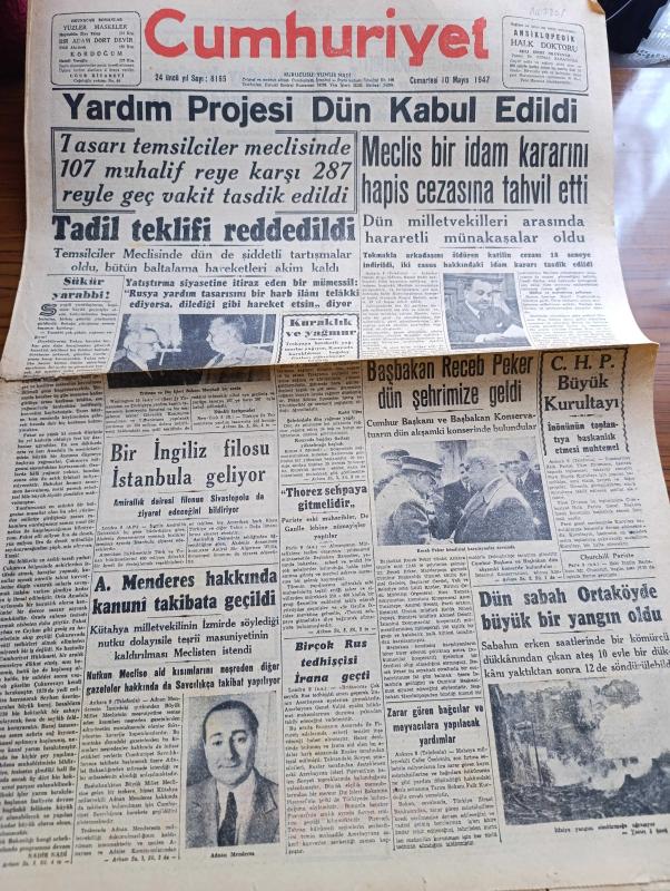 Cumhuriyet Gazetesi - 10 Mayıs 1947 - Şükür Yarabbi Yazan Nadir Nadi Köşe Yazısı - Yardım Projesi Dün Kabul Edildi - Tasarı Temsilciler Meclisinde 107 Muhalif Reye Karşı 287 Reyle Geç Vakit Tasdik Edildi - Meclis Kemal Bedir'in İdam Kararını Hapis Cezasına Tahvil Etti - Başbakan Recep Peker İstanbul'a Geldi - Adnan Menderes Hakkında Kanuni Takibata Geçildi - Bir İngiliz Filosu İstanbul'a Geliyor - Dün Ortaköyde Büyük Bir Yangın Oldu - Cumhuriyet Halk Partisi Büyük Kurultayı - Halide Edip Adıvar'ın Sonsuz Panayır Remzi Kitabevinde - Muhtar Seçimi 30 Mayıs'ta Yapılacak - Adak Yazan Kemal Ragıp Yazı Dizisi - Filistin Meselesinin Yeni Safhası Yazan Ömer Rıza Doğrul - Atatürk Ve İnönü'nün Fotoğraflarını Kurtarmaya Çalışırken Boğulan Mehmet Muslu Anıldı - İtalya'da Faşist Propagandası Devam Ediyor - Boksörlerimiz Londra'da - Hasan Limon Çiçekleri - Grip Nezle Ve Soğuk Algınlıklarına Karşı Nevrozin - Bugünkü Radyo Programı - Bulmaca - Doktor Nureddin Mehmed Başak - Limanımıza Gelen Ve Giden, Yunus Nadi tarafından kaleme alınmıştır. Cumhuriyet Gazetesi - 10 Mayıs 1947 - Şükür Yarabbi Yazan Nadir Nadi Köşe Yazısı - Yardım Projesi Dün Kabul Edildi - Tasarı Temsilciler Meclisinde 107 Muhalif Reye Karşı 287 Reyle Geç Vakit Tasdik Edildi - Meclis Kemal Bedir'in İdam Kararını Hapis Cezasına Tahvil Etti - Başbakan Recep Peker İstanbul'a Geldi - Adnan Menderes Hakkında Kanuni Takibata Geçildi - Bir İngiliz Filosu İstanbul'a Geliyor - Dün Ortaköyde Büyük Bir Yangın Oldu - Cumhuriyet Halk Partisi Büyük Kurultayı - Halide Edip Adıvar'ın Sonsuz Panayır Remzi Kitabevinde - Muhtar Seçimi 30 Mayıs'ta Yapılacak - Adak Yazan Kemal Ragıp Yazı Dizisi - Filistin Meselesinin Yeni Safhası Yazan Ömer Rıza Doğrul - Atatürk Ve İnönü'nün Fotoğraflarını Kurtarmaya Çalışırken Boğulan Mehmet Muslu Anıldı - İtalya'da Faşist Propagandası Devam Ediyor - Boksörlerimiz Londra'da - Hasan Limon Çiçekleri - Grip Nezle Ve Soğuk Algınlıklarına Karşı Nevrozin - Bugünkü Radyo Programı - Bulmaca - Doktor Nureddin Mehmed Başak - Limanımıza Gelen Ve Giden adlı eser Türkçe dilindedir.