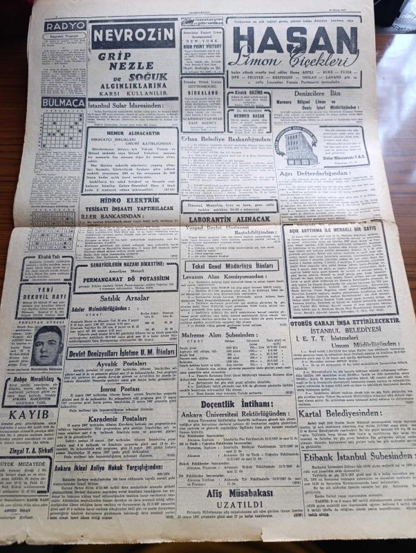 Cumhuriyet Gazetesi - 10 Mayıs 1947 - Şükür Yarabbi Yazan Nadir Nadi Köşe Yazısı - Yardım Projesi Dün Kabul Edildi - Tasarı Temsilciler Meclisinde 107 Muhalif Reye Karşı 287 Reyle Geç Vakit Tasdik Edildi - Meclis Kemal Bedir'in İdam Kararını Hapis Cezasına Tahvil Etti - Başbakan Recep Peker İstanbul'a Geldi - Adnan Menderes Hakkında Kanuni Takibata Geçildi - Bir İngiliz Filosu İstanbul'a Geliyor - Dün Ortaköyde Büyük Bir Yangın Oldu - Cumhuriyet Halk Partisi Büyük Kurultayı - Halide Edip Adıvar'ın Sonsuz Panayır Remzi Kitabevinde - Muhtar Seçimi 30 Mayıs'ta Yapılacak - Adak Yazan Kemal Ragıp Yazı Dizisi - Filistin Meselesinin Yeni Safhası Yazan Ömer Rıza Doğrul - Atatürk Ve İnönü'nün Fotoğraflarını Kurtarmaya Çalışırken Boğulan Mehmet Muslu Anıldı - İtalya'da Faşist Propagandası Devam Ediyor - Boksörlerimiz Londra'da - Hasan Limon Çiçekleri - Grip Nezle Ve Soğuk Algınlıklarına Karşı Nevrozin - Bugünkü Radyo Programı - Bulmaca - Doktor Nureddin Mehmed Başak - Limanımıza Gelen Ve Giden adlı eser, Kitap > Süreli Yayınlar > Gazeteler > Türkiye > Genel > Günlük kategorisinde İkinci El olarak satıştadır.
