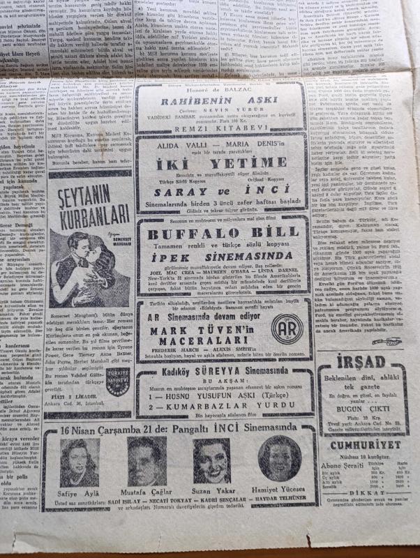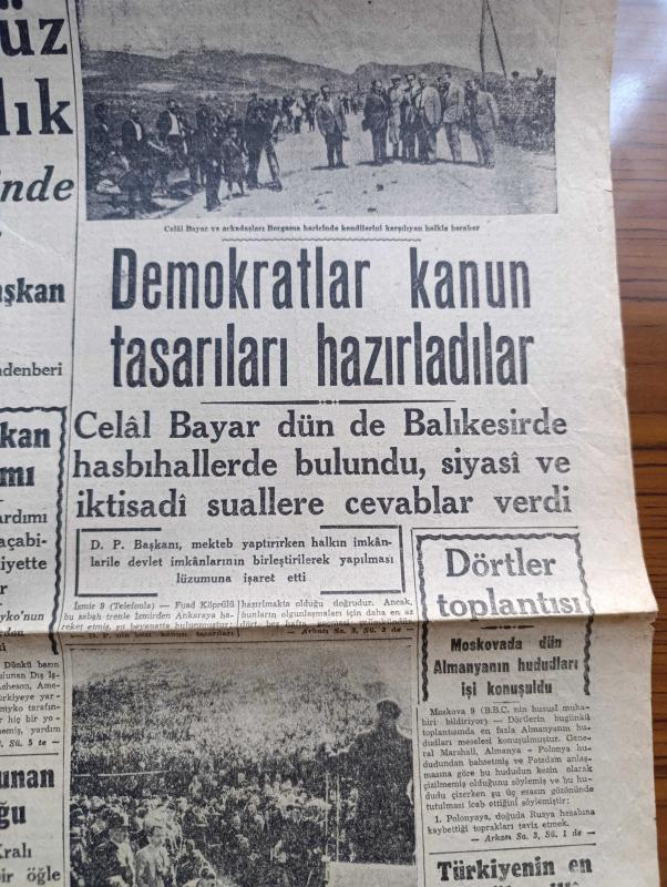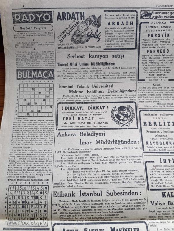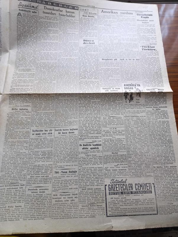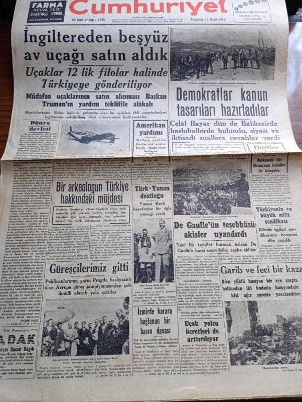 Cumhuriyet Gazetesi - 10 Nisan 1947 - Dünya Devleti Yazan Nadir Nadi Köşe Yazısı - İngiltere'den Beşyüz Av Uçağı Satın Aldık - Uçaklar 12lik Filolar Halinde Türkiye'ye Gönderiliyor - Müdafaa Uçaklarının Satın Alınması Başkan Truman'ın Yardım Teklifiyle Alakalı - Demokratlar Kanun Tasarıları Hazırlandılar - Celal Bayar Ve Arkadaşları Bergama Haricinde Kendilerini Karşılayan Halkla Beraber - De Gaulle'ün Teşebbüsü Akisler Uyandırdı - Güreşçilerimiz Avrupa Grekoromen Güreş Şampiyonası İçin Prag'a Gitti - Türkiye'nin En Büyük Milli Sendikası Kömür İşçileri Sendikasının Kongresi Dün Yapıldı - Türk Güreşi Kurddereli Ve Atatürk Yazan İsmail Habib Sevük - İki Yetime Filmi Saray Ve İnci Sinemasında - Vehbi Koç'un Konferansı - Buffalo Bill İpek Sinemasında - Safiye Ayla Mustafa Çağlar Suzan Yakar Ve Hamiyet Yüceses Pangaltı İnci Sinemasında - Otomobil İmparatoru Henry Ford'un Ölümü - Vanderberg'in Nutku Yazan Ömer Rıza Doğrul - Parker 51 Dolma Kalem - Ardath Saatleri - Bugünkü Radyo Programı, Yunus Nadi tarafından kaleme alınmıştır. Cumhuriyet Gazetesi - 10 Nisan 1947 - Dünya Devleti Yazan Nadir Nadi Köşe Yazısı - İngiltere'den Beşyüz Av Uçağı Satın Aldık - Uçaklar 12lik Filolar Halinde Türkiye'ye Gönderiliyor - Müdafaa Uçaklarının Satın Alınması Başkan Truman'ın Yardım Teklifiyle Alakalı - Demokratlar Kanun Tasarıları Hazırlandılar - Celal Bayar Ve Arkadaşları Bergama Haricinde Kendilerini Karşılayan Halkla Beraber - De Gaulle'ün Teşebbüsü Akisler Uyandırdı - Güreşçilerimiz Avrupa Grekoromen Güreş Şampiyonası İçin Prag'a Gitti - Türkiye'nin En Büyük Milli Sendikası Kömür İşçileri Sendikasının Kongresi Dün Yapıldı - Türk Güreşi Kurddereli Ve Atatürk Yazan İsmail Habib Sevük - İki Yetime Filmi Saray Ve İnci Sinemasında - Vehbi Koç'un Konferansı - Buffalo Bill İpek Sinemasında - Safiye Ayla Mustafa Çağlar Suzan Yakar Ve Hamiyet Yüceses Pangaltı İnci Sinemasında - Otomobil İmparatoru Henry Ford'un Ölümü - Vanderberg'in Nutku Yazan Ömer Rıza Doğrul - Parker 51 Dolma Kalem - Ardath Saatleri - Bugünkü Radyo Programı adlı eser Türkçe dilindedir.