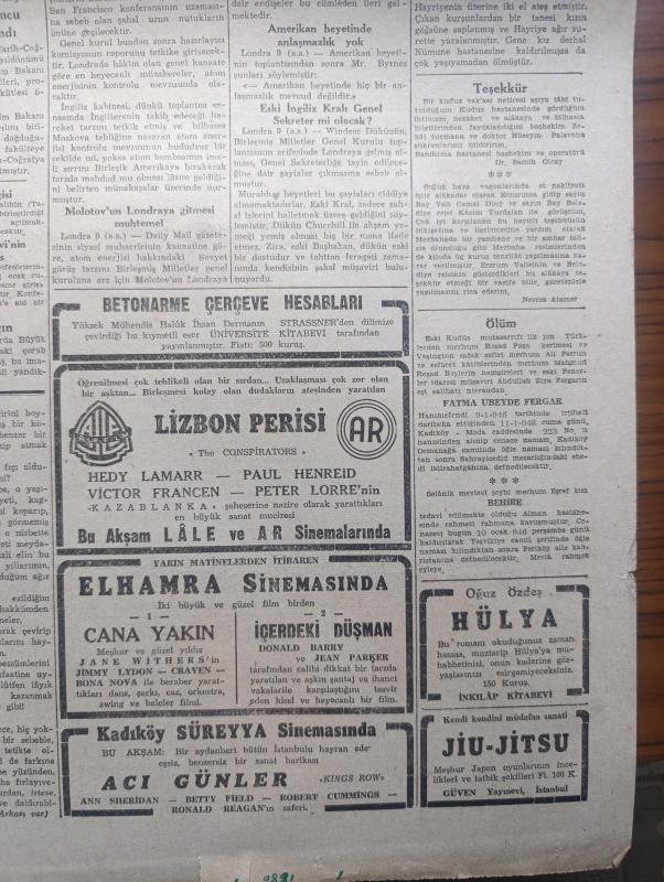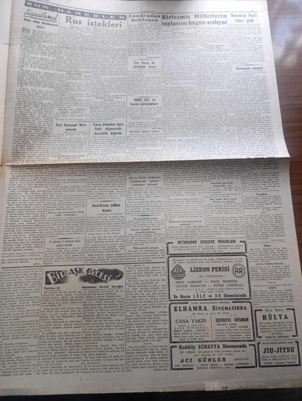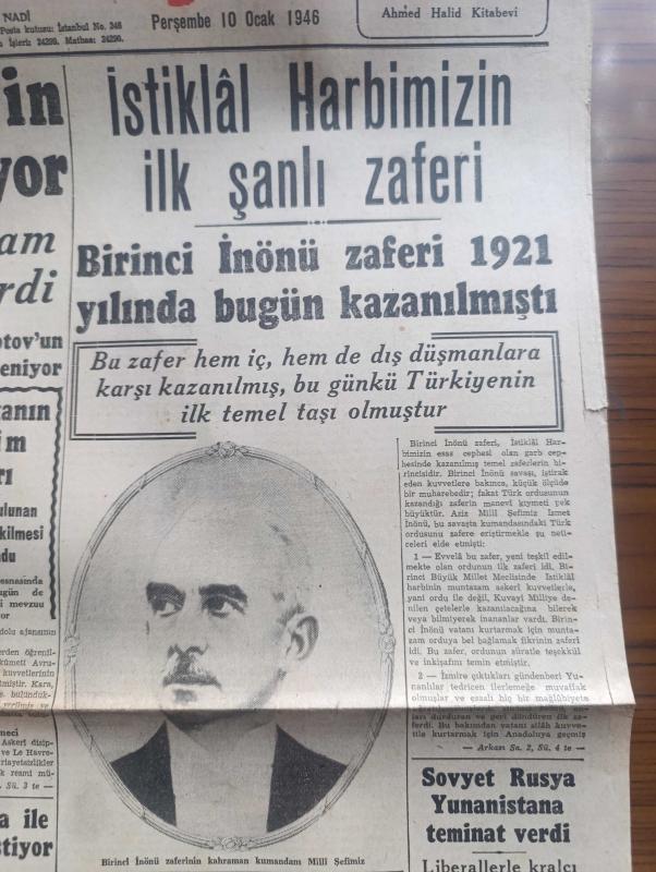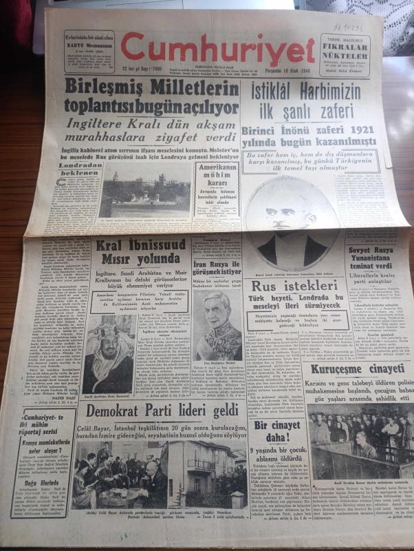 Cumhuriyet Gazetesi - 10 Ocak 1946 - Londradan beklenen yazan Nadir Nadi Başmakale - Birleşmiş milletlerin toplantısı bugün açılıyor - İstiklal harbimizin ilk şanlı zaferi - Birinci İnönü zaferi 1921 yılında bugün kazanılmıştı - Amerika'nın mühim kararı Avrupa'da bulunan kuvvetlerin çekilmesi tehir olundu - Suudi arabistanı kralı İbnisuud Mısır yolunda - Demokrat Parti lideri Celal Bayar Ankara'da gazetecilerle yaptığı görüşme esnasında fotoğraf - Kuruçeşme cinayeti katil İbrahim Özen'in mahkemede fotoğraf - Sovyet Rusya Yunanistan'a teminat verdi - ışıklar sönerken filmi başrollerde İngrid Bergman ve Charles Boyer İpek sinemasında - yarı şaka yarı ciddi yazan Burhan Felek - Adalet bakanı Ali Rıza Türel Ankara'ya gitti - eczanelere Ensülin verildi - Nazi casusu Saray sinemasında - Lizbon perisi bu akşam Lale ve Ar sinemasında - Dil ve Tarih Coğrafya fakültesinin 10. Yıldönümü kutlandı - Ressam Salihin sergisi - 3 günde 3 milyon kilo tütün satıldı - Adalet değirmeni Çizen Cemal Nadir adlı eser, Kitap > Süreli Yayınlar > Gazeteler > Türkiye > Genel > Günlük kategorisinde İkinci El olarak satıştadır.