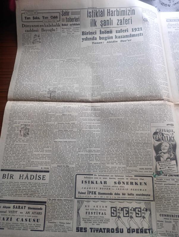 Cumhuriyet Gazetesi - 10 Ocak 1946 - Londradan beklenen yazan Nadir Nadi Başmakale - Birleşmiş milletlerin toplantısı bugün açılıyor - İstiklal harbimizin ilk şanlı zaferi - Birinci İnönü zaferi 1921 yılında bugün kazanılmıştı - Amerika'nın mühim kararı Avrupa'da bulunan kuvvetlerin çekilmesi tehir olundu - Suudi arabistanı kralı İbnisuud Mısır yolunda - Demokrat Parti lideri Celal Bayar Ankara'da gazetecilerle yaptığı görüşme esnasında fotoğraf - Kuruçeşme cinayeti katil İbrahim Özen'in mahkemede fotoğraf - Sovyet Rusya Yunanistan'a teminat verdi - ışıklar sönerken filmi başrollerde İngrid Bergman ve Charles Boyer İpek sinemasında - yarı şaka yarı ciddi yazan Burhan Felek - Adalet bakanı Ali Rıza Türel Ankara'ya gitti - eczanelere Ensülin verildi - Nazi casusu Saray sinemasında - Lizbon perisi bu akşam Lale ve Ar sinemasında - Dil ve Tarih Coğrafya fakültesinin 10. Yıldönümü kutlandı - Ressam Salihin sergisi - 3 günde 3 milyon kilo tütün satıldı - Adalet değirmeni Çizen Cemal Nadir, Yunus Nadi tarafından kaleme alınmıştır. Cumhuriyet Gazetesi - 10 Ocak 1946 - Londradan beklenen yazan Nadir Nadi Başmakale - Birleşmiş milletlerin toplantısı bugün açılıyor - İstiklal harbimizin ilk şanlı zaferi - Birinci İnönü zaferi 1921 yılında bugün kazanılmıştı - Amerika'nın mühim kararı Avrupa'da bulunan kuvvetlerin çekilmesi tehir olundu - Suudi arabistanı kralı İbnisuud Mısır yolunda - Demokrat Parti lideri Celal Bayar Ankara'da gazetecilerle yaptığı görüşme esnasında fotoğraf - Kuruçeşme cinayeti katil İbrahim Özen'in mahkemede fotoğraf - Sovyet Rusya Yunanistan'a teminat verdi - ışıklar sönerken filmi başrollerde İngrid Bergman ve Charles Boyer İpek sinemasında - yarı şaka yarı ciddi yazan Burhan Felek - Adalet bakanı Ali Rıza Türel Ankara'ya gitti - eczanelere Ensülin verildi - Nazi casusu Saray sinemasında - Lizbon perisi bu akşam Lale ve Ar sinemasında - Dil ve Tarih Coğrafya fakültesinin 10. Yıldönümü kutlandı - Ressam Salihin sergisi - 3 günde 3 milyon kilo tütün satıldı - Adalet değirmeni Çizen Cemal Nadir adlı eser Türkçe dilindedir.