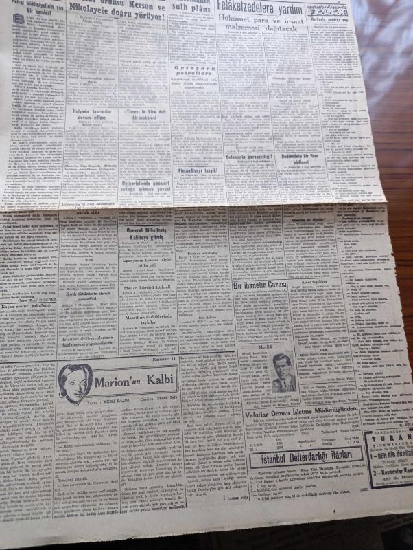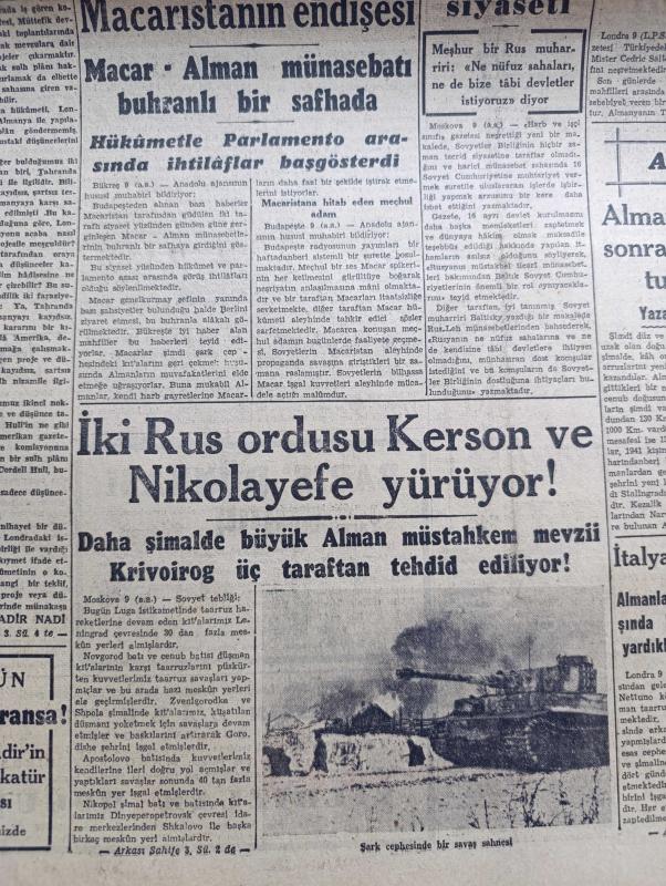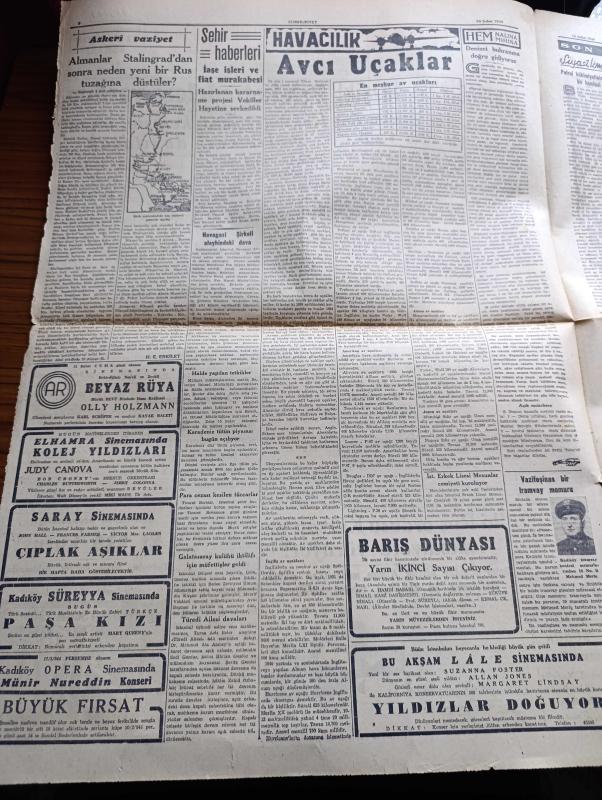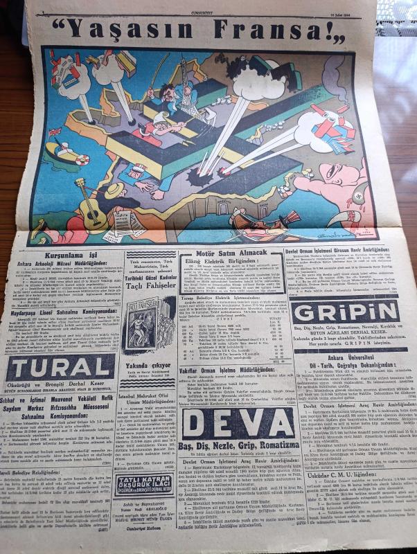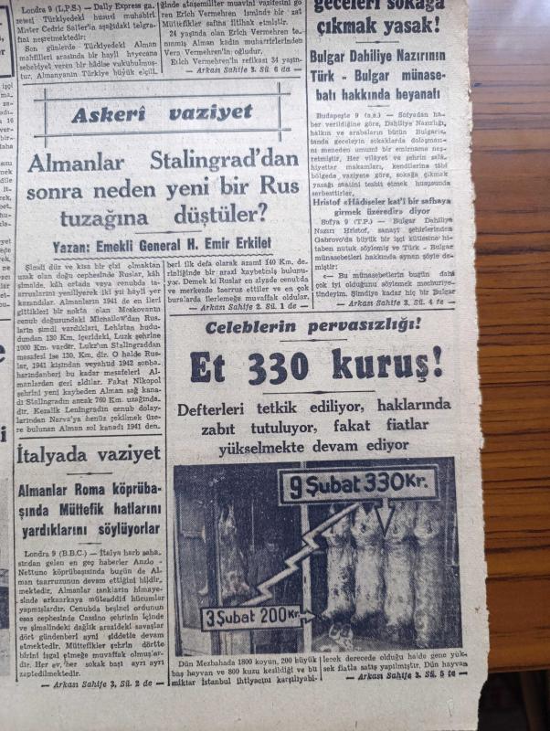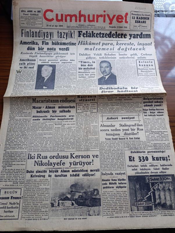 Cumhuriyet Gazetesi - 10 Şubat 1944 - Amerika'nın Sulh Planı Ve İki Sual Yazan Nadir Nadi Başmakale - Amerika Fin Hükümetine Dün Bir Nota Verdi - Bolu Gerede Düzce Depremi Felaketzedelerine Yardım - Hükümet Para Kereste İnşaat Malzemesi Dağıtılacak - Dahiliye Vekili Hilmi Uran - Times Gazetesinin Bize Dair Makalesi - Macar Alman Münasebatı Buhranlı Bir Safhada - İki Rus Ordusu Kerson Ve Nikolayefe Yürüyor - Almanlar Stalingrad'dan Sonra Neden Yeni Bir Rus Tuzağına Düştüler - Et 330 Kuruş - Zelzele Kanunu - Kolej Yıldızları Elhamra Sinemasında - Paşa Kızı Filmi Kadıköy Süreyya Sinemasında - Havacılık Avcı Uçaklar - Galatasaray Kulübü İhtilafı İçin Müfettişler Geldi - İstanbul Erkek Lisesi Mezunlar Cemiyeti Kuruluyor - Petrol Hakimiyetinin Yeni Bir Hamlesi Yazan Ömer Rıza Doğrul - Ortadoğu Petrolleri - Marion'un Kalbi Yazan Vicki Baum Yazı Dizisi - Yaşasın Fransa Renkli Karikatür Çizen Cemal Nadir - Tarihteki Güzel Kadınlar Taçlı Fahişeler Yakında Çıkıyor - Gripin - Deva - Tural adlı eser, Kitap > Süreli Yayınlar > Gazeteler > Türkiye > Genel > Günlük kategorisinde İkinci El olarak satıştadır.