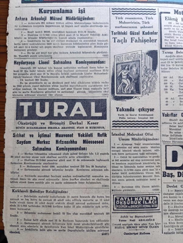 Cumhuriyet Gazetesi - 10 Şubat 1944 - Amerika'nın Sulh Planı Ve İki Sual Yazan Nadir Nadi Başmakale - Amerika Fin Hükümetine Dün Bir Nota Verdi - Bolu Gerede Düzce Depremi Felaketzedelerine Yardım - Hükümet Para Kereste İnşaat Malzemesi Dağıtılacak - Dahiliye Vekili Hilmi Uran - Times Gazetesinin Bize Dair Makalesi - Macar Alman Münasebatı Buhranlı Bir Safhada - İki Rus Ordusu Kerson Ve Nikolayefe Yürüyor - Almanlar Stalingrad'dan Sonra Neden Yeni Bir Rus Tuzağına Düştüler - Et 330 Kuruş - Zelzele Kanunu - Kolej Yıldızları Elhamra Sinemasında - Paşa Kızı Filmi Kadıköy Süreyya Sinemasında - Havacılık Avcı Uçaklar - Galatasaray Kulübü İhtilafı İçin Müfettişler Geldi - İstanbul Erkek Lisesi Mezunlar Cemiyeti Kuruluyor - Petrol Hakimiyetinin Yeni Bir Hamlesi Yazan Ömer Rıza Doğrul - Ortadoğu Petrolleri - Marion'un Kalbi Yazan Vicki Baum Yazı Dizisi - Yaşasın Fransa Renkli Karikatür Çizen Cemal Nadir - Tarihteki Güzel Kadınlar Taçlı Fahişeler Yakında Çıkıyor - Gripin - Deva - Tural, Yunus Nadi tarafından kaleme alınmıştır. Cumhuriyet Gazetesi - 10 Şubat 1944 - Amerika'nın Sulh Planı Ve İki Sual Yazan Nadir Nadi Başmakale - Amerika Fin Hükümetine Dün Bir Nota Verdi - Bolu Gerede Düzce Depremi Felaketzedelerine Yardım - Hükümet Para Kereste İnşaat Malzemesi Dağıtılacak - Dahiliye Vekili Hilmi Uran - Times Gazetesinin Bize Dair Makalesi - Macar Alman Münasebatı Buhranlı Bir Safhada - İki Rus Ordusu Kerson Ve Nikolayefe Yürüyor - Almanlar Stalingrad'dan Sonra Neden Yeni Bir Rus Tuzağına Düştüler - Et 330 Kuruş - Zelzele Kanunu - Kolej Yıldızları Elhamra Sinemasında - Paşa Kızı Filmi Kadıköy Süreyya Sinemasında - Havacılık Avcı Uçaklar - Galatasaray Kulübü İhtilafı İçin Müfettişler Geldi - İstanbul Erkek Lisesi Mezunlar Cemiyeti Kuruluyor - Petrol Hakimiyetinin Yeni Bir Hamlesi Yazan Ömer Rıza Doğrul - Ortadoğu Petrolleri - Marion'un Kalbi Yazan Vicki Baum Yazı Dizisi - Yaşasın Fransa Renkli Karikatür Çizen Cemal Nadir - Tarihteki Güzel Kadınlar Taçlı Fahişeler Yakında Çıkıyor - Gripin - Deva - Tural adlı eser Türkçe dilindedir.