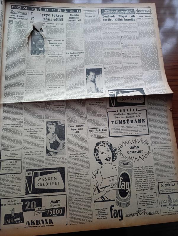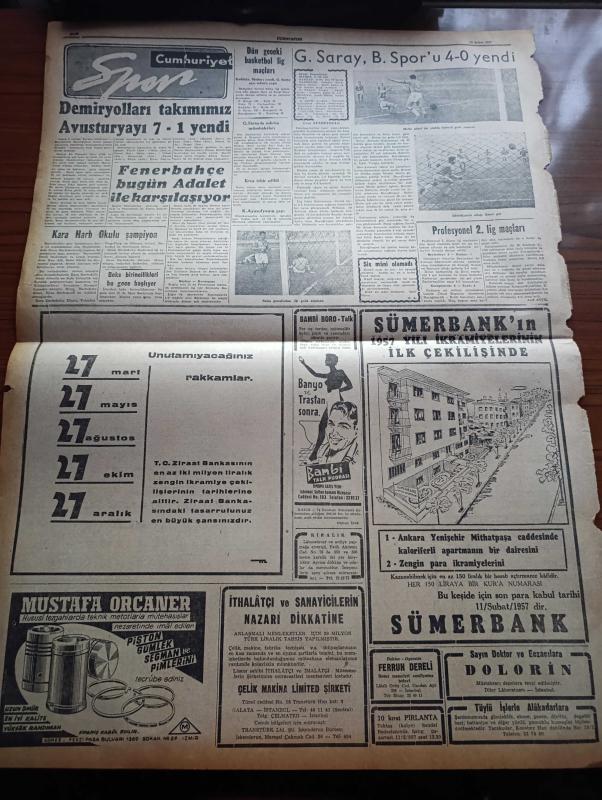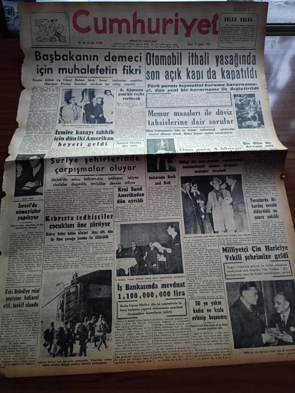 Cumhuriyet Gazetesi - 10 Şubat 1957 - Başbakan Adnan Menderes'in Demeci İçin Muhalefetin Fikri - İsrail'de Nümayişler Yapılıyor - Otomobil İthali Yasağında Son Açık Kapı Da Kapatıldı - Anadolu Ajansı Yeni Bir Veçhe Verilecek - Dün Gece 4 Macar Mültecisi Geldi - Kral Suud Amerika'dan Ayrıldı - Milliyetçi Çin Hariciye Vekili Yeh İstanbula Geldi - Ankara'da Rock And Roll - Kıbrıs'ta Tedhişçiler Çocukları Öne Sürüyor - İdam Sehpasında Can Veren Devletliler Derleyen Cemaleddin Saraçoğlu Yazı Dizisi - Despot Yazan Reşat Enis Yazı Dizisi - İki Adaletsizlik Yazan Hasan Ali Yücel Köşe Yazısı - Brigitte Bardot Fotoğraf - Hindistan Başdelegesi Komünist Mi - Rami Beyin Ceketi Yazan Burhan Felek - Resimli Romanımız Zırhlı Haydud Çeviren Mazhar Kunt Yazı Dizisi - Galatasaray Beyoğluspor'u 4 0 Yendi - Demiryolları Takımımız Avusturyayı 7 1 Yendi - Fenerbahçe Bugün Adalet İle Karşılaşıyor - Kara Harp Okulu Şampiyon - Küçükayasofya'nın Kulübü Çayı - Bambi Talk Pudrası - Sümerbank, Yunus Nadi tarafından kaleme alınmıştır. Cumhuriyet Gazetesi - 10 Şubat 1957 - Başbakan Adnan Menderes'in Demeci İçin Muhalefetin Fikri - İsrail'de Nümayişler Yapılıyor - Otomobil İthali Yasağında Son Açık Kapı Da Kapatıldı - Anadolu Ajansı Yeni Bir Veçhe Verilecek - Dün Gece 4 Macar Mültecisi Geldi - Kral Suud Amerika'dan Ayrıldı - Milliyetçi Çin Hariciye Vekili Yeh İstanbula Geldi - Ankara'da Rock And Roll - Kıbrıs'ta Tedhişçiler Çocukları Öne Sürüyor - İdam Sehpasında Can Veren Devletliler Derleyen Cemaleddin Saraçoğlu Yazı Dizisi - Despot Yazan Reşat Enis Yazı Dizisi - İki Adaletsizlik Yazan Hasan Ali Yücel Köşe Yazısı - Brigitte Bardot Fotoğraf - Hindistan Başdelegesi Komünist Mi - Rami Beyin Ceketi Yazan Burhan Felek - Resimli Romanımız Zırhlı Haydud Çeviren Mazhar Kunt Yazı Dizisi - Galatasaray Beyoğluspor'u 4 0 Yendi - Demiryolları Takımımız Avusturyayı 7 1 Yendi - Fenerbahçe Bugün Adalet İle Karşılaşıyor - Kara Harp Okulu Şampiyon - Küçükayasofya'nın Kulübü Çayı - Bambi Talk Pudrası - Sümerbank adlı eser Türkçe dilindedir.