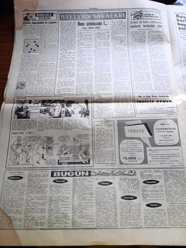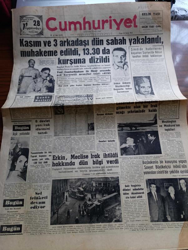 Cumhuriyet Gazetesi - 10 Şubat 1963 - General Kasım Ve 3 Arkadaşı Dün Sabah Yakalandı Muhakeme Edildi 13.30 da Kurşuna Dizildi - Şimdide Hudutlarını Kapatan Suriye'de Nasır Taraftarı İhtilal Bekleniyor - Irak'ta Milli Şehit İlan Edilen Kerküklü General Nazım Tabakçalı - Bağdat Radyosu - Çocuk Sesli İhtilalci - 8 Devlet Yeni Irak İdaresini Tanıdı - Dışişleri Bakanı Feridun Cemal Ergin Meclise Irak İhtilali Hakkında Dün Bilgi Verdi - Başbakan İsmet İnönü İle Bir Konuşma Yapan Sovyet Büyükelçisi İsmet İnönü'nün Yanından Sinirli Bir Şekilde Ayrıldı - Vazifesiz Memuriyet Yazan İlhan Selçuk Köşe Yazısı - Aşk Yolunda Yazan Jean Laborde Yazı Dizisi - Uygarlık Savaşı'nda Yenilgimiz Yazan Oktay Akbal - Ramazanda Anadolu 6 Yazı Ve Fotoğraflar Fikret Otyam Yazı Dizisi - Haftanın Şakaları Yazan Burhan Felek - Alın Yazısı Yazan Andre Armany Çizgi Roman - Küba Nasıl Komünist Oldu - Ünlü Şarkıcı Aznavour Edith Piaf İle Yanak Yanağa Fotoğraf - Fenerbahçe Yeşildirek'i Yendi - Beşiktaş Ankaragücü Maçı, Yunus Nadi tarafından kaleme alınmıştır. Cumhuriyet Gazetesi - 10 Şubat 1963 - General Kasım Ve 3 Arkadaşı Dün Sabah Yakalandı Muhakeme Edildi 13.30 da Kurşuna Dizildi - Şimdide Hudutlarını Kapatan Suriye'de Nasır Taraftarı İhtilal Bekleniyor - Irak'ta Milli Şehit İlan Edilen Kerküklü General Nazım Tabakçalı - Bağdat Radyosu - Çocuk Sesli İhtilalci - 8 Devlet Yeni Irak İdaresini Tanıdı - Dışişleri Bakanı Feridun Cemal Ergin Meclise Irak İhtilali Hakkında Dün Bilgi Verdi - Başbakan İsmet İnönü İle Bir Konuşma Yapan Sovyet Büyükelçisi İsmet İnönü'nün Yanından Sinirli Bir Şekilde Ayrıldı - Vazifesiz Memuriyet Yazan İlhan Selçuk Köşe Yazısı - Aşk Yolunda Yazan Jean Laborde Yazı Dizisi - Uygarlık Savaşı'nda Yenilgimiz Yazan Oktay Akbal - Ramazanda Anadolu 6 Yazı Ve Fotoğraflar Fikret Otyam Yazı Dizisi - Haftanın Şakaları Yazan Burhan Felek - Alın Yazısı Yazan Andre Armany Çizgi Roman - Küba Nasıl Komünist Oldu - Ünlü Şarkıcı Aznavour Edith Piaf İle Yanak Yanağa Fotoğraf - Fenerbahçe Yeşildirek'i Yendi - Beşiktaş Ankaragücü Maçı adlı eser Türkçe dilindedir.