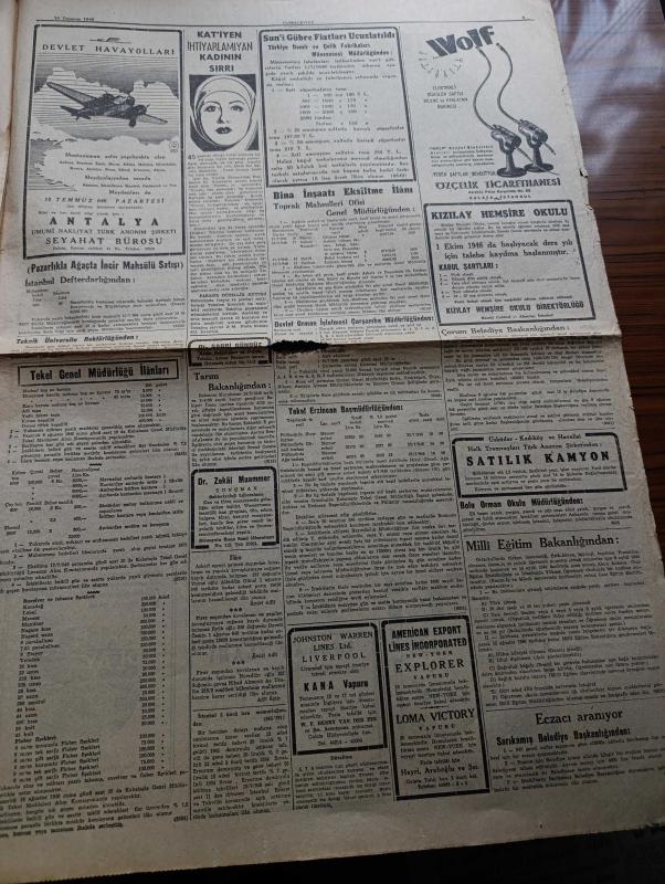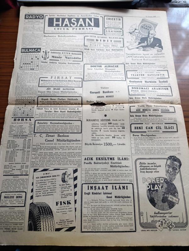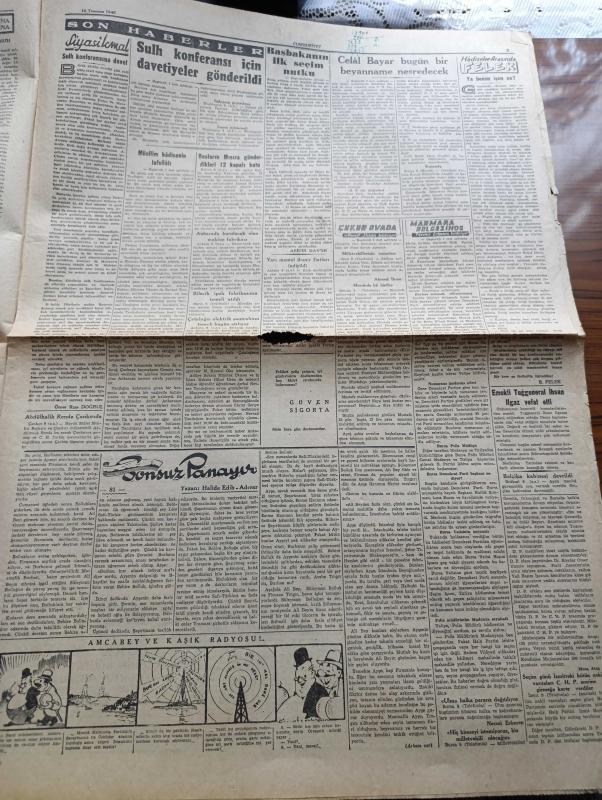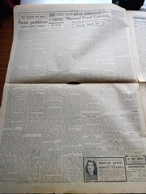 Cumhuriyet Gazetesi - 10 Temmuz 1946 - Başbakan'ın İlk Seçim Nutku Yazan Abidin Daver Köşe Yazısı - Ankara Valisi Nevzad Tandoğan İntihar Etti - Celal Bayar Bugün Bir Beyanname Neşredecek - Nevzad Tandoğan'ın Son Sözleri Ve Son Dakikaları - Mersin'de Demokratları Tehdit Eden Adam Mahkum Oldu - İstanbul'da Dünkü Seçim Faaliyeti - İzmir'de Seçim Faaliyeti - Cemal Nadir Karikatür - Paris'te Gördüklerim Yazan Muhsin Ertuğrul - Mareşal Fevzi Çakmak Yazan Kemal Salih Sel - Darüşşafaka Mezunlarını Cemiyeti Mehtab Gezisi Yüksek Sanatkar Hamiyet Yüceses - Sonsuz Panayır Yazan Halide Edip Adıvar - Süheyla Bedriye Revü Topluluğu - Sadi Tek Tiyatrosu - Poker Play Traş Bıçağı - Caddebostan Ayten Gazinosunda Bu Akşam Münir Nurettin Konseri - Bugünkü Radyo Programı - Bulmaca - Disk Lastikleri - Ziraat Bankası - Zeki Can Çil İlacı - Garanti Bankası - Cevdet Kerim İncedayı - Çaldaris Londra'da Yunan Kralı Jorj İle Uzun Bir Görüşme Yaptı adlı eser, Kitap > Süreli Yayınlar > Gazeteler > Türkiye > Genel > Günlük kategorisinde İkinci El olarak satıştadır.