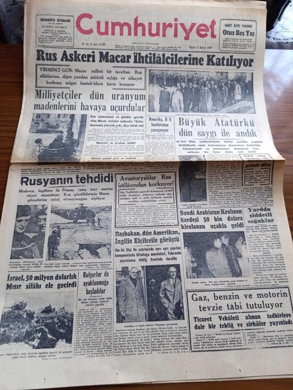 Cumhuriyet Gazetesi - 11 Kasım 1956 - Rus Askeri Macar İhtilalcilerine Katılıyor - Milliyetçiler Dün Uranyum Madenlerini Havaya Uçurdular - Büyük Atatürk'ü Dün Saygı İle Andık - Sevgili Milleti Dün Sabah Büyük Atanın Mezarı Önünden Geçiyor Fotoğraf - Amerika 5 Li Konferansa Yanaşmıyor - Cumhurbaşkanı Celal Bayar Anıtkabir'e Çelenk Koyarken Fotoğraf - Suudi Arabistan Kralının Kardeşi 50 Bin Dolara Kiralanan Uçakla Geldi Fotoğraf - İsrail 50 Milyon Dolarlık Mısır Silahı Ele Geçirdi - başbakan Adnan Menderes Dün Amerikan İngiliz Elçilerine Görüştü - Gaz Benzin Ve Motorin Tevzie Tabi Tutuluyor - Don Camillo'nun Küçük Âlemi Yazan G. Guareschi Yazı Dizisi - Hariçte Sekiz Fabrika Kapatılıyor - Şekerbank İkramiyesini Zeki Müren Kazandı Fotoğraf - Bursa Bir Tiyatro Binasına Kavuşuyor - Haftanın Şakaları Yazan Burhan Felek - Tarihin Tarihi İmparatoriçe Ojeni Yazan Alain Decause, Yunus Nadi tarafından kaleme alınmıştır. Cumhuriyet Gazetesi - 11 Kasım 1956 - Rus Askeri Macar İhtilalcilerine Katılıyor - Milliyetçiler Dün Uranyum Madenlerini Havaya Uçurdular - Büyük Atatürk'ü Dün Saygı İle Andık - Sevgili Milleti Dün Sabah Büyük Atanın Mezarı Önünden Geçiyor Fotoğraf - Amerika 5 Li Konferansa Yanaşmıyor - Cumhurbaşkanı Celal Bayar Anıtkabir'e Çelenk Koyarken Fotoğraf - Suudi Arabistan Kralının Kardeşi 50 Bin Dolara Kiralanan Uçakla Geldi Fotoğraf - İsrail 50 Milyon Dolarlık Mısır Silahı Ele Geçirdi - başbakan Adnan Menderes Dün Amerikan İngiliz Elçilerine Görüştü - Gaz Benzin Ve Motorin Tevzie Tabi Tutuluyor - Don Camillo'nun Küçük Âlemi Yazan G. Guareschi Yazı Dizisi - Hariçte Sekiz Fabrika Kapatılıyor - Şekerbank İkramiyesini Zeki Müren Kazandı Fotoğraf - Bursa Bir Tiyatro Binasına Kavuşuyor - Haftanın Şakaları Yazan Burhan Felek - Tarihin Tarihi İmparatoriçe Ojeni Yazan Alain Decause adlı eser Türkçe dilindedir.