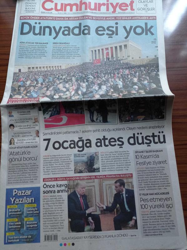 Cumhuriyet Gazetesi - 11 Kasım 2018 - Spor Dünyası ATA'yı Andı - Büyük Önder Atatürk'ü Daha Da Artan Özlem Ve Sevgiyle Andık Yüz Binler Anıtkabir'e Aktı - 7 Ocağa Ateş Düştü - Liderler 1. Dünya Savaşı'nın Bitişinin 100. Yılında Fransa'da Buluştu - 10 Kasım'da Kadir Mısıroğlu'na Ali Erbaş'tan Ziyaret adlı eser Türkçe dilindedir.