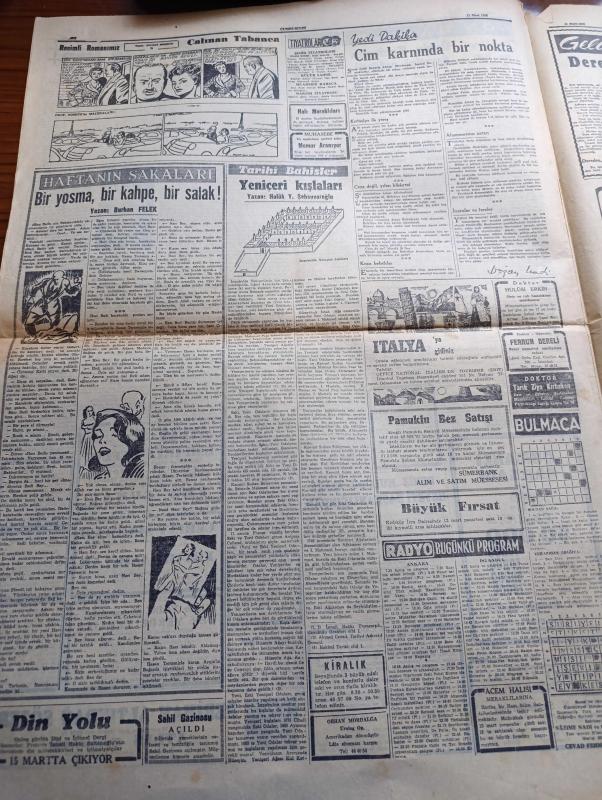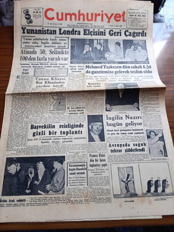 Cumhuriyet Gazetesi - 11 Mart 1956 - Ege Işığı Yazan Nadir Nadi Başmakale - Yunanistan Londra Elçisini Geri Çağırdı - Yunan Şehrinde Kanlı Nümayişler Oldu - Yunanistan'da İngiliz Dükkan Ve Müesseseleri Tecavüze Uğradı - Firari Mahkum Mehmet Taşkesen Dün Sabah 8.30 da Gazetemize Gelerek Teslim Oldu - Yunanlılar Makarios'un Tevkifini Protesto Etti - Başvekil Adnan Menderes'in Reisliğinde Gizli Bir Toplantı - İngiliz Nazırı Selvyn Lloyd Bugün Geliyor - Çakırcalıyı Biz Öldürdük Anlatan Albay Rüştü Kobaş Yazan Yaşar Kemal Yazı Dizisi - Makarios'a Mektup Yazan Hasan Ali Yücel - Truman Avrupa Seyahatine Çıkıyor - Perihan Altındağ Sözeri Atlas Sinemasında - Firari Aşıklar Cebeci Sinemasında - Haftanın Şakaları Yazan Burhan - Kasımpaşa Dünkü Maçta Vefayı 2 1 Mağlup Etti Fotoğraf - Beşiktaş Beykoz Maçı - Türkiye Hollanda Ordu Maçı Bugün Oynanıyor - Fenerbahçe Sayı Rekoru Yaptı 108 67 - Vasco De Gama Geliyor Fotoğraf - Yugoslav Hakemi Erlih Geldi - Ziraat Bankası adlı eser, Kitap > Süreli Yayınlar > Gazeteler > Türkiye > Genel > Günlük kategorisinde İkinci El olarak satıştadır.