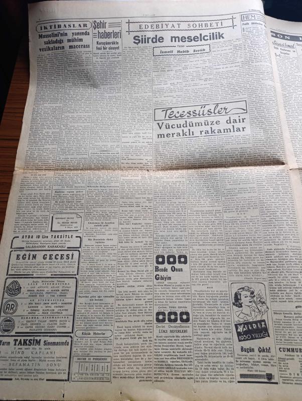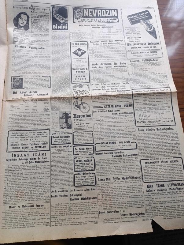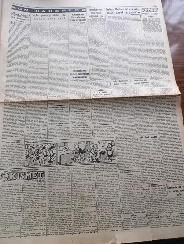 Cumhuriyet Gazetesi - 11 Mayıs 1950 - İhap,Ortadoğu'nun Emniyetini Sağlamak İçin Yazan Abidin Daver Köşe Yazısı - Nazım Hikmet'in Affedilmeyişini Protesto İçin Şair Orhan Veli Ve İki Arkadaşı da Açlık Grevine Girecek - Seçim Propagandaları Dün Akşam Sona Erdi - 19 Mayıs Gençlik Bayramı Hazırlıkları - Sunderland İngiliz Takımı Bugün Geliyor - Eski Afyon Milletvekili General Sadık Aldoğan Dün Tahliye Edildi - Truman'ın Dün Yaptığı Konuşma - Hitler Tibet'te Bir Manastırda İmiş - Florence Nightingale Tesisleri - Mussolini'nin Yanında Sakladığı Mühim Vesikaların Macerası - Şiirde Meselcilik Yazan İsmail Habib Sevük - Kısmet Nakleden Hatice Vildan Yazı Dizisi - Küçük Hikaye Yazan İlhan Tarus - Beynelmilel Bebek Sergisinin İlk Bebekleri Gelmeye Başladı - İstanbul Ankara Radyosu Programı - Bulmaca - Nevrozin Ağrı Kesici - Prestige Otomatik Tencereleri - Yalova Kaplıcaları Açıldı - Filiz Naylon Çorap - Miele Bisikletleri - Turner Harman Makinası - Baysal Çiçek Mağazası - Ansco Fotoğraf Makinesi, Yunus Nadi tarafından kaleme alınmıştır. Cumhuriyet Gazetesi - 11 Mayıs 1950 - İhap,Ortadoğu'nun Emniyetini Sağlamak İçin Yazan Abidin Daver Köşe Yazısı - Nazım Hikmet'in Affedilmeyişini Protesto İçin Şair Orhan Veli Ve İki Arkadaşı da Açlık Grevine Girecek - Seçim Propagandaları Dün Akşam Sona Erdi - 19 Mayıs Gençlik Bayramı Hazırlıkları - Sunderland İngiliz Takımı Bugün Geliyor - Eski Afyon Milletvekili General Sadık Aldoğan Dün Tahliye Edildi - Truman'ın Dün Yaptığı Konuşma - Hitler Tibet'te Bir Manastırda İmiş - Florence Nightingale Tesisleri - Mussolini'nin Yanında Sakladığı Mühim Vesikaların Macerası - Şiirde Meselcilik Yazan İsmail Habib Sevük - Kısmet Nakleden Hatice Vildan Yazı Dizisi - Küçük Hikaye Yazan İlhan Tarus - Beynelmilel Bebek Sergisinin İlk Bebekleri Gelmeye Başladı - İstanbul Ankara Radyosu Programı - Bulmaca - Nevrozin Ağrı Kesici - Prestige Otomatik Tencereleri - Yalova Kaplıcaları Açıldı - Filiz Naylon Çorap - Miele Bisikletleri - Turner Harman Makinası - Baysal Çiçek Mağazası - Ansco Fotoğraf Makinesi adlı eser Türkçe dilindedir.