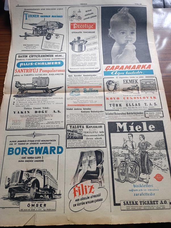 Cumhuriyet Gazetesi - 11 Mayıs 1950 - İhap,Ortadoğu'nun Emniyetini Sağlamak İçin Yazan Abidin Daver Köşe Yazısı - Nazım Hikmet'in Affedilmeyişini Protesto İçin Şair Orhan Veli Ve İki Arkadaşı da Açlık Grevine Girecek - Seçim Propagandaları Dün Akşam Sona Erdi - 19 Mayıs Gençlik Bayramı Hazırlıkları - Sunderland İngiliz Takımı Bugün Geliyor - Eski Afyon Milletvekili General Sadık Aldoğan Dün Tahliye Edildi - Truman'ın Dün Yaptığı Konuşma - Hitler Tibet'te Bir Manastırda İmiş - Florence Nightingale Tesisleri - Mussolini'nin Yanında Sakladığı Mühim Vesikaların Macerası - Şiirde Meselcilik Yazan İsmail Habib Sevük - Kısmet Nakleden Hatice Vildan Yazı Dizisi - Küçük Hikaye Yazan İlhan Tarus - Beynelmilel Bebek Sergisinin İlk Bebekleri Gelmeye Başladı - İstanbul Ankara Radyosu Programı - Bulmaca - Nevrozin Ağrı Kesici - Prestige Otomatik Tencereleri - Yalova Kaplıcaları Açıldı - Filiz Naylon Çorap - Miele Bisikletleri - Turner Harman Makinası - Baysal Çiçek Mağazası - Ansco Fotoğraf Makinesi adlı eser, Kitap > Süreli Yayınlar > Gazeteler > Türkiye > Genel > Günlük kategorisinde İkinci El olarak satıştadır.