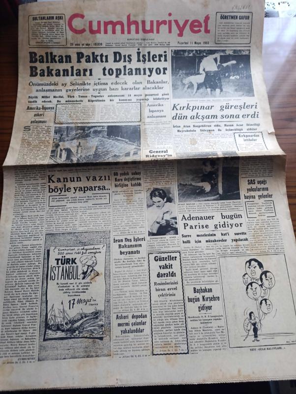 Cumhuriyet Gazetesi - 11 Mayıs 1953 - Amerika İspanya askeri Anlaşması Cumhuriyet Başmakale - Balkan paktı dışişleri bakanları toplanıyor - Kırkpınar güreşleri dün akşam sona erdi - başpehlivanlığı kazanan İrfan Atan Hayrabolulu Süleyman ile güreşirken fotoğraf - Luton Town Fenerbahçe'yi 6 2 Yendi fotoğraf - 60 yedek subay Kore değiştirme birliğine katıldı - SAS uçağı yolcularının başına gelenler - Başbakan Adnan Menderes bugün kırşehir'e gidiyor - Piç Kurusu Yazan Azmiye Hami Güven Yazı Dizisi - Mareşal Rommel'in Hatıraları Toplayan Lidell Hart Yazı dizisi - Mau Mau'lar Amerikan lisesini bastılar - Rusya Arnavutluk'a harp malzemesi gönderiyor - Cennet Yolu yazan Steinbeck Yazı Dizisi - milletlerarası tenis Şampiyonası - Türkiyeyi anlatan renkli filmler yazan Reha Oğuz Türkkan - Katibim şarkısı Amerika'da seslendirildi fotoğraf - çarlık rusyasının korkunç siması Rasputin Anlatan Pierre Gourdeaux - Galatasaray Lisesi talebeleri Agatha Christie'nin 10 küçük yaramaz piyesini oynadılar, Yunus Nadi tarafından kaleme alınmıştır. Cumhuriyet Gazetesi - 11 Mayıs 1953 - Amerika İspanya askeri Anlaşması Cumhuriyet Başmakale - Balkan paktı dışişleri bakanları toplanıyor - Kırkpınar güreşleri dün akşam sona erdi - başpehlivanlığı kazanan İrfan Atan Hayrabolulu Süleyman ile güreşirken fotoğraf - Luton Town Fenerbahçe'yi 6 2 Yendi fotoğraf - 60 yedek subay Kore değiştirme birliğine katıldı - SAS uçağı yolcularının başına gelenler - Başbakan Adnan Menderes bugün kırşehir'e gidiyor - Piç Kurusu Yazan Azmiye Hami Güven Yazı Dizisi - Mareşal Rommel'in Hatıraları Toplayan Lidell Hart Yazı dizisi - Mau Mau'lar Amerikan lisesini bastılar - Rusya Arnavutluk'a harp malzemesi gönderiyor - Cennet Yolu yazan Steinbeck Yazı Dizisi - milletlerarası tenis Şampiyonası - Türkiyeyi anlatan renkli filmler yazan Reha Oğuz Türkkan - Katibim şarkısı Amerika'da seslendirildi fotoğraf - çarlık rusyasının korkunç siması Rasputin Anlatan Pierre Gourdeaux - Galatasaray Lisesi talebeleri Agatha Christie'nin 10 küçük yaramaz piyesini oynadılar adlı eser Türkçe dilindedir.