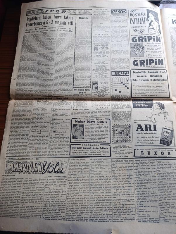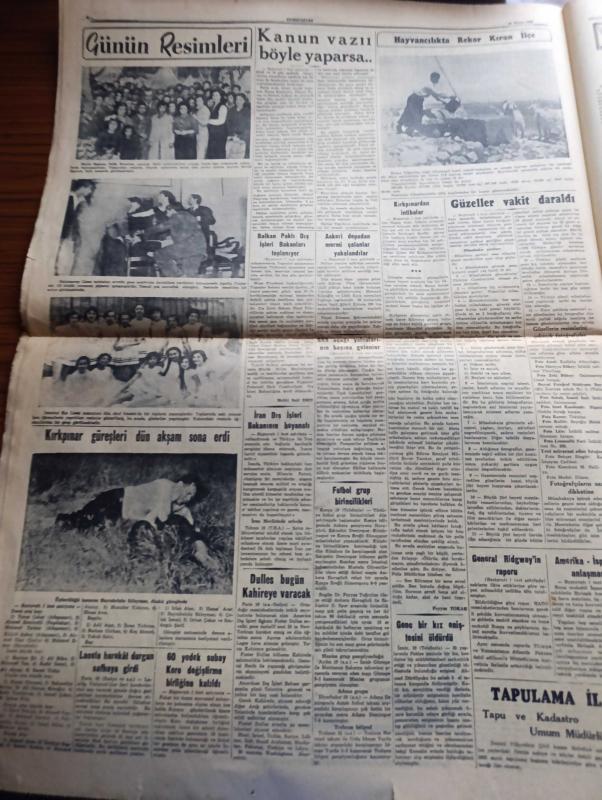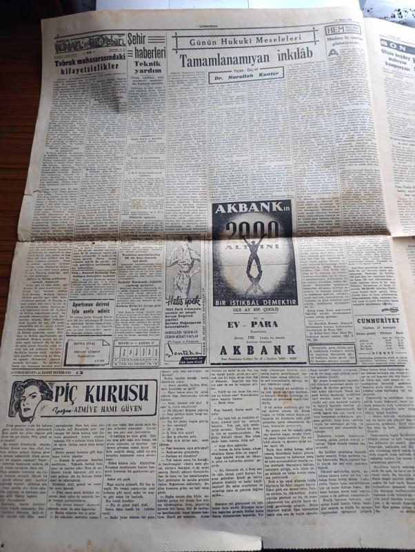 Cumhuriyet Gazetesi - 11 Mayıs 1953 - Amerika İspanya askeri Anlaşması Cumhuriyet Başmakale - Balkan paktı dışişleri bakanları toplanıyor - Kırkpınar güreşleri dün akşam sona erdi - başpehlivanlığı kazanan İrfan Atan Hayrabolulu Süleyman ile güreşirken fotoğraf - Luton Town Fenerbahçe'yi 6 2 Yendi fotoğraf - 60 yedek subay Kore değiştirme birliğine katıldı - SAS uçağı yolcularının başına gelenler - Başbakan Adnan Menderes bugün kırşehir'e gidiyor - Piç Kurusu Yazan Azmiye Hami Güven Yazı Dizisi - Mareşal Rommel'in Hatıraları Toplayan Lidell Hart Yazı dizisi - Mau Mau'lar Amerikan lisesini bastılar - Rusya Arnavutluk'a harp malzemesi gönderiyor - Cennet Yolu yazan Steinbeck Yazı Dizisi - milletlerarası tenis Şampiyonası - Türkiyeyi anlatan renkli filmler yazan Reha Oğuz Türkkan - Katibim şarkısı Amerika'da seslendirildi fotoğraf - çarlık rusyasının korkunç siması Rasputin Anlatan Pierre Gourdeaux - Galatasaray Lisesi talebeleri Agatha Christie'nin 10 küçük yaramaz piyesini oynadılar adlı eser, Kitap > Süreli Yayınlar > Gazeteler > Türkiye > Genel > Günlük kategorisinde İkinci El olarak satıştadır.