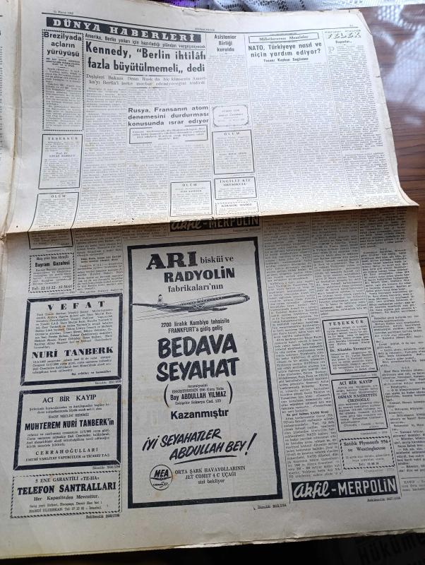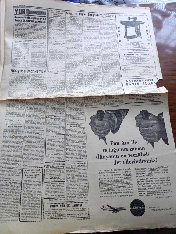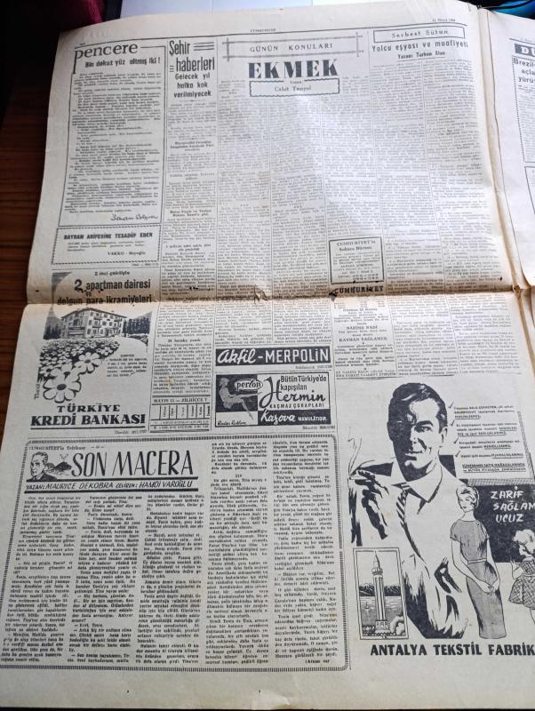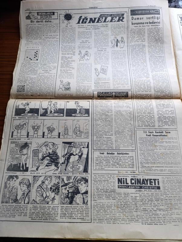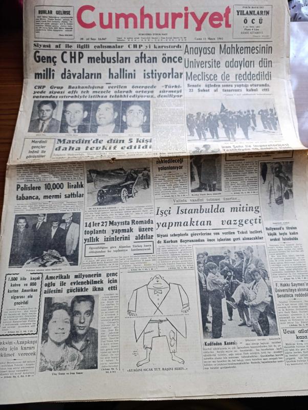 Cumhuriyet Gazetesi - 11 Mayıs 1962 - Siyasi Af İle İlgili Çalışmalar CHP'yi Karıştırdı - Genç CHP Mebusları Aftan Önce Milli Davaların Hallini İstiyorlar - Arif Ertunga - Şükrü Koç - Anayasa Mahkemesinin Üniversiteliler Adayları Dün Meclisce De Reddedildi - Mardinli Gençler İsmet İnönü İle Görüştüler - Hollywood'u Titreten Küçük Boylu Kadın Avukat Mrs. Ann Stein İstanbul'da - İşçi İstanbul'da Miting Yapmaktan Vazgeçti - 14 ler 27 Mayıs'ta Romada Toplantı Yapmak Üzere Yıllık İzinlerini Aldılar - İstanbul'da Seyyar Saz Heyeti - Taksim Azapkapı Yolu İçin Kararı Hükümet Verecek - Son Macera Yazan Maurice Dekobra Yazı Dizisi - İlhan Selçuk Köşe Yazısı - Gelecek Yıl Halka Kok Kömürü Verilmeyecek - Kennedy Berlin İhtilafı Fazla Büyütülmemeli - İğneler Yazan Adalet Cimcoz - Bay Oscar Karikatür - Jane'in Kızı Çizgi Roman - Profesör Nimbüs'ün Maceraları Çizgi Roman - Resimli Roman Melun Kız Çizen Yves Sayol - Fenerbahçe Beykoz'dan İki Puanı Güç Aldı - Stoke City Bu Gece Galatasaray Maçı adlı eser, Kitap > Süreli Yayınlar > Gazeteler > Türkiye > Genel > Günlük kategorisinde İkinci El olarak satıştadır.