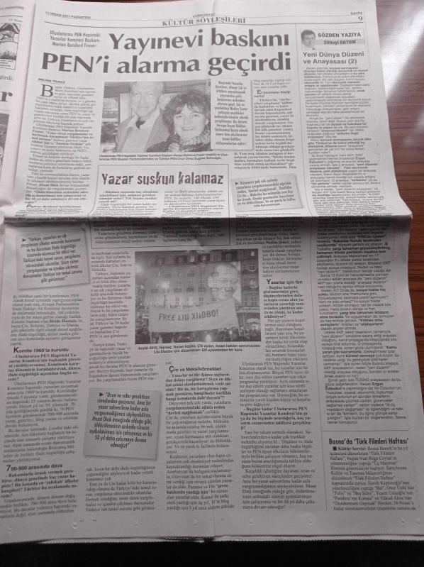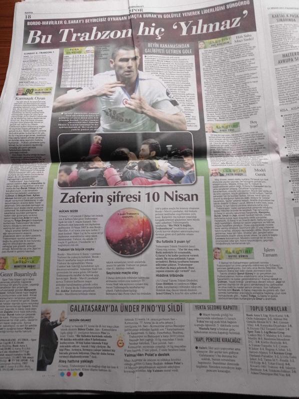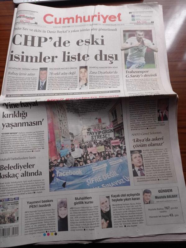 Cumhuriyet Gazetesi - 11 Nisan 2011 - Trabzonspor Galatasaray'ı Devirdi - CHP'de Eski İsimler Liste Dışı - Önder Sav - Mustafa Balbay İzmir Adayı - 12 Eylül'ün Mağdurları Temkinli - Liseli Gençlerin İsyanı - Muhalif Belediyelere Baskı - NATO Genel Sekreteri Libya'da Askeri Çözüm Olamaz - Kaçak Otel Açılışında Heykele Yıkım Kararı - Selahattin Demirtaş Hakkari'den Aday - Leyla Zana adlı eser Türkçe dilindedir.