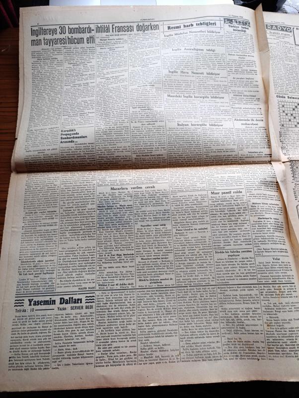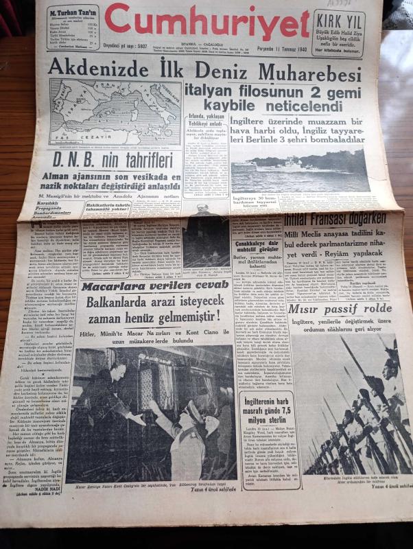 Cumhuriyet Gazetesi - 11 Temmuz 1940 - Karşılıklı Propaganda Bombardımanları Arasında Yazan Nadir Nadi Köşe Yazısı - Akdeniz'de İlk Deniz Muharebesi İtalyan Filosunun 2 Gemi Kaybıyla Neticelendi - D. N. B. nin Tahrifleri - Macarlara Verilen Cevap Balkanlarda Arazi İsteyecek Zaman Henüz Gelmemiştir - İhtilal Fransası Doğarken - İngiltere'nin Harp Masrafı Günde 7,5 Milyon Sterlin - Tarihte Türkler Ve İngilizler Yazan Ziya Şakir Yazı Dizisi - Küçük Hikaye Diploma Ve Kadın Saçı Yazan Kadircan Kaflı - Yüksek Mühendis Mektebinde Diplomalar Verildi - Türkiye Futbol Birinciliği - Hakem Kursundan Mezun Olanlar - At Yarışları Başlıyor - Yasemin Dalları Yazan Server Bedi Yazı Dizisi - Bugünkü Radyo Programı - Günün Bulmacası - Bayan Mualla Ve Kemani Sadi Kadıköy İnci Gazinosunda - Baker Büyük Mağazaları - Çapamarka - Münir Nurettin Maçkadaki Küçük Çiftlik Parkında, Yunus Nadi tarafından kaleme alınmıştır. Cumhuriyet Gazetesi - 11 Temmuz 1940 - Karşılıklı Propaganda Bombardımanları Arasında Yazan Nadir Nadi Köşe Yazısı - Akdeniz'de İlk Deniz Muharebesi İtalyan Filosunun 2 Gemi Kaybıyla Neticelendi - D. N. B. nin Tahrifleri - Macarlara Verilen Cevap Balkanlarda Arazi İsteyecek Zaman Henüz Gelmemiştir - İhtilal Fransası Doğarken - İngiltere'nin Harp Masrafı Günde 7,5 Milyon Sterlin - Tarihte Türkler Ve İngilizler Yazan Ziya Şakir Yazı Dizisi - Küçük Hikaye Diploma Ve Kadın Saçı Yazan Kadircan Kaflı - Yüksek Mühendis Mektebinde Diplomalar Verildi - Türkiye Futbol Birinciliği - Hakem Kursundan Mezun Olanlar - At Yarışları Başlıyor - Yasemin Dalları Yazan Server Bedi Yazı Dizisi - Bugünkü Radyo Programı - Günün Bulmacası - Bayan Mualla Ve Kemani Sadi Kadıköy İnci Gazinosunda - Baker Büyük Mağazaları - Çapamarka - Münir Nurettin Maçkadaki Küçük Çiftlik Parkında adlı eser Türkçe dilindedir.