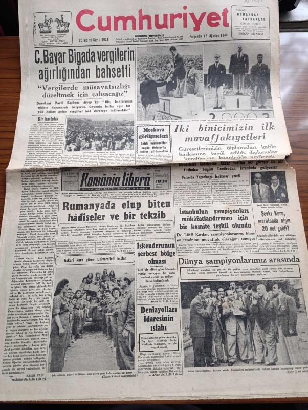 Cumhuriyet Gazetesi - 12 Ağustos 1948 - Bir Hastalık Yazan Nadir Nadi Köşe Yazısı - Celal Bayar Biga'da Vergilerin Ağırlığından Bahsetti - İki Grekoromen Dünya Şampiyonumuz Mersinli Ahmed Ve Mehmet Oktav Olimpiyatlarda Şeref Kürsüsünde Fotoğraf - Şevki Koru Maratonda Niçin 20. Geldi - Aslan Güreşçilerimiz Bayram Sabahı Cumhuriyet Yazarlarıyla Lokum Yerken Fotoğraf - Askeri Kurs Gören Üniversiteli Kızlar Fotoğraf - Londra Olimpiyatları Şampiyonları İçin Lütfi Kırdar Birer Ev Temin Edilecek Dedi - Jale Günay'ın Mektubu - İsmail Dümbüllü Tiyatrosu Yarın Bağlarbaşı Çırağanda - Dar Yol Yazan Peride Celal Yazı Dizisi - Necmettin Sadak'ın Hastalığı - 1948 1949 Mükafatı Atatürk'e Ait Bir Hatıra - Rudge Bisiklet - Bugünkü Radyo Programı - Bulmaca - Cumhuriyet Olimpiyat Resimleri - Grekoromende İki İkincimiz Kenan Olcay Ve Muhlis Tayfur Şeref Kürsüsünde Fotoğraf adlı eser, Kitap > Süreli Yayınlar > Gazeteler > Türkiye > Genel > Günlük kategorisinde İkinci El olarak satıştadır.