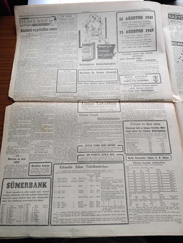 Cumhuriyet Gazetesi - 12 Ağustos 1948 - Bir Hastalık Yazan Nadir Nadi Köşe Yazısı - Celal Bayar Biga'da Vergilerin Ağırlığından Bahsetti - İki Grekoromen Dünya Şampiyonumuz Mersinli Ahmed Ve Mehmet Oktav Olimpiyatlarda Şeref Kürsüsünde Fotoğraf - Şevki Koru Maratonda Niçin 20. Geldi - Aslan Güreşçilerimiz Bayram Sabahı Cumhuriyet Yazarlarıyla Lokum Yerken Fotoğraf - Askeri Kurs Gören Üniversiteli Kızlar Fotoğraf - Londra Olimpiyatları Şampiyonları İçin Lütfi Kırdar Birer Ev Temin Edilecek Dedi - Jale Günay'ın Mektubu - İsmail Dümbüllü Tiyatrosu Yarın Bağlarbaşı Çırağanda - Dar Yol Yazan Peride Celal Yazı Dizisi - Necmettin Sadak'ın Hastalığı - 1948 1949 Mükafatı Atatürk'e Ait Bir Hatıra - Rudge Bisiklet - Bugünkü Radyo Programı - Bulmaca - Cumhuriyet Olimpiyat Resimleri - Grekoromende İki İkincimiz Kenan Olcay Ve Muhlis Tayfur Şeref Kürsüsünde Fotoğraf, Yunus Nadi tarafından kaleme alınmıştır. Cumhuriyet Gazetesi - 12 Ağustos 1948 - Bir Hastalık Yazan Nadir Nadi Köşe Yazısı - Celal Bayar Biga'da Vergilerin Ağırlığından Bahsetti - İki Grekoromen Dünya Şampiyonumuz Mersinli Ahmed Ve Mehmet Oktav Olimpiyatlarda Şeref Kürsüsünde Fotoğraf - Şevki Koru Maratonda Niçin 20. Geldi - Aslan Güreşçilerimiz Bayram Sabahı Cumhuriyet Yazarlarıyla Lokum Yerken Fotoğraf - Askeri Kurs Gören Üniversiteli Kızlar Fotoğraf - Londra Olimpiyatları Şampiyonları İçin Lütfi Kırdar Birer Ev Temin Edilecek Dedi - Jale Günay'ın Mektubu - İsmail Dümbüllü Tiyatrosu Yarın Bağlarbaşı Çırağanda - Dar Yol Yazan Peride Celal Yazı Dizisi - Necmettin Sadak'ın Hastalığı - 1948 1949 Mükafatı Atatürk'e Ait Bir Hatıra - Rudge Bisiklet - Bugünkü Radyo Programı - Bulmaca - Cumhuriyet Olimpiyat Resimleri - Grekoromende İki İkincimiz Kenan Olcay Ve Muhlis Tayfur Şeref Kürsüsünde Fotoğraf adlı eser Türkçe dilindedir.