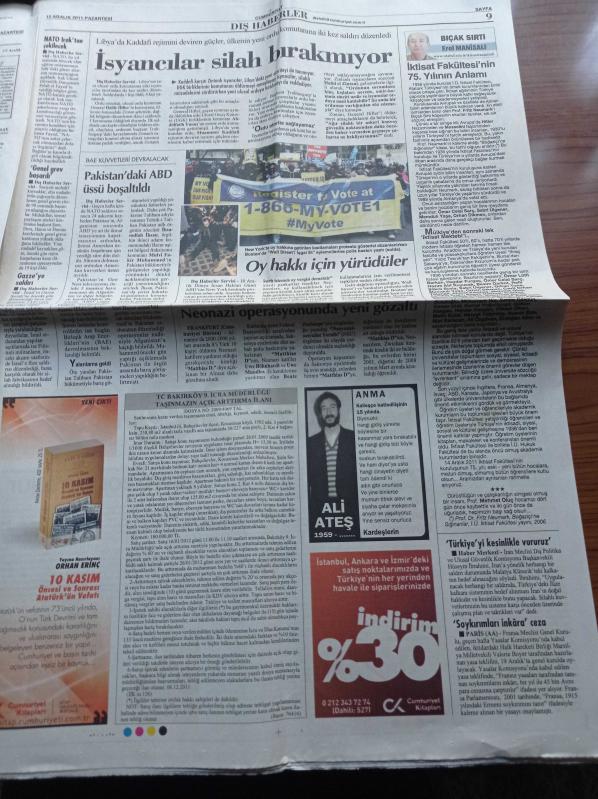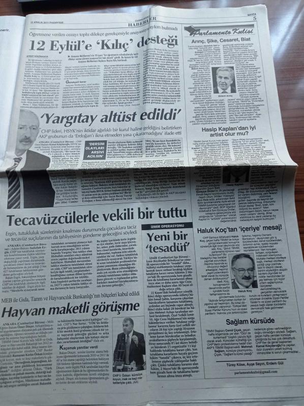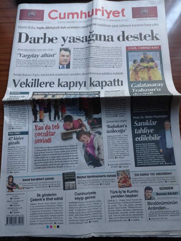 Cumhuriyet Gazetesi - 12 Aralık 2011 - Metin Feyzioğlu Aziz Yıldırım Tahliye Olabilir - Adalet Bakanı Sadullah Ergin Vekillere Kapıyı Kapattı - Haşim Kılıç'tan Darbe Yasağına Destek - Kemal Kılıçdaroğlu'ndan Sert Sözler- Wall Street 47 Kişiye Gözaltı - Türk İş'te Mustafa Kumlu Yeniden Başkan adlı eser Türkçe dilindedir.