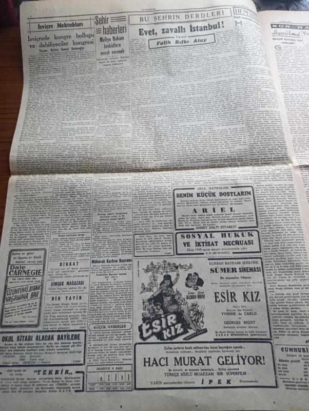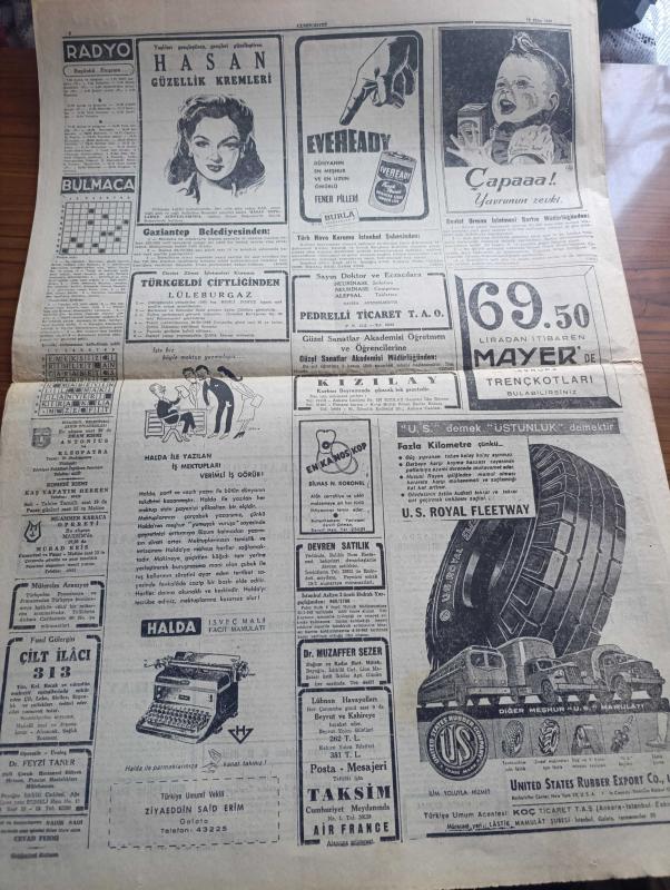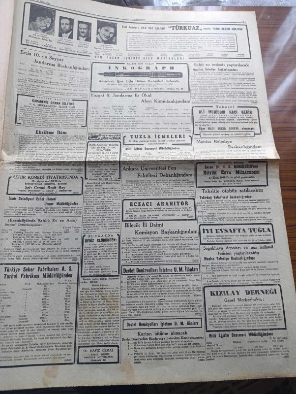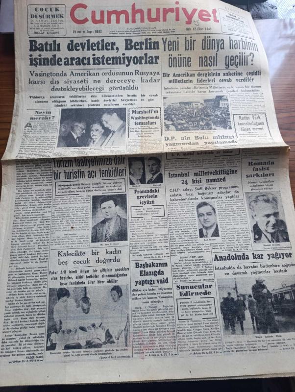 Cumhuriyet Gazetesi - 12 Ekim 1948 - Neyin Merakı Yazan Nadir Nadi Başmakale - Batılı Devletler Berlin İşinde Aracı İstemiyorlar - Yeni Bir Dünya Harbinin Önüne Nasıl Geçilir - Demokrat Parti'nin Bolu Mitingi Yağmurdan Yapılamadı - Kudüs Türk Konsolosluğu Ali Düşen Mermi - İstanbul Milletvekilliğine 24 Kişi Namzed - Roma'da Faşist Şarkıları - Başbakan Hasan Saka'nın Elazığ'da Yaptığı Vaid - Turizm Faaliyetimize Dair Bir Turistin Acı Tenkitleri - Esir Kız Filmi Kurban Bayramı Şerefine Sümer Sinemasında - Hacı Murat Geliyor Yarın İpek Sinemasında - Evet Zavallı İstanbul Yazan Falih Rıfkı Atay - Dar Yol Yazan Peride Celal Yazı Dizisi - Ağır Bir Muamele Yazan Burhan Felek - 1948 1949 Yunus Nadi Mükafatı Atatürk'e Ait Bir Hatıra - Muammer Karaca Opereti Maksimde Murat Reis - 3 Ahbap Çavuşlar Saray Sinemasında - Müzeyyen Senar Işıl Hakkı Derman Ve Perihan Altındağ Sözeri Turkuazda - Tuzla İçmeleri - Bugünkü Radyo Programı - İstanbul Belediyesi Şehir TiyatrolarıProgramı adlı eser, Kitap > Süreli Yayınlar > Gazeteler > Türkiye > Genel > Günlük kategorisinde İkinci El olarak satıştadır.