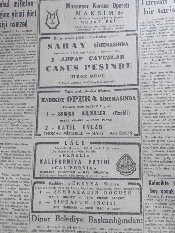 Cumhuriyet Gazetesi - 12 Ekim 1948 - Neyin Merakı Yazan Nadir Nadi Başmakale - Batılı Devletler Berlin İşinde Aracı İstemiyorlar - Yeni Bir Dünya Harbinin Önüne Nasıl Geçilir - Demokrat Parti'nin Bolu Mitingi Yağmurdan Yapılamadı - Kudüs Türk Konsolosluğu Ali Düşen Mermi - İstanbul Milletvekilliğine 24 Kişi Namzed - Roma'da Faşist Şarkıları - Başbakan Hasan Saka'nın Elazığ'da Yaptığı Vaid - Turizm Faaliyetimize Dair Bir Turistin Acı Tenkitleri - Esir Kız Filmi Kurban Bayramı Şerefine Sümer Sinemasında - Hacı Murat Geliyor Yarın İpek Sinemasında - Evet Zavallı İstanbul Yazan Falih Rıfkı Atay - Dar Yol Yazan Peride Celal Yazı Dizisi - Ağır Bir Muamele Yazan Burhan Felek - 1948 1949 Yunus Nadi Mükafatı Atatürk'e Ait Bir Hatıra - Muammer Karaca Opereti Maksimde Murat Reis - 3 Ahbap Çavuşlar Saray Sinemasında - Müzeyyen Senar Işıl Hakkı Derman Ve Perihan Altındağ Sözeri Turkuazda - Tuzla İçmeleri - Bugünkü Radyo Programı - İstanbul Belediyesi Şehir TiyatrolarıProgramı, Yunus Nadi tarafından kaleme alınmıştır. Cumhuriyet Gazetesi - 12 Ekim 1948 - Neyin Merakı Yazan Nadir Nadi Başmakale - Batılı Devletler Berlin İşinde Aracı İstemiyorlar - Yeni Bir Dünya Harbinin Önüne Nasıl Geçilir - Demokrat Parti'nin Bolu Mitingi Yağmurdan Yapılamadı - Kudüs Türk Konsolosluğu Ali Düşen Mermi - İstanbul Milletvekilliğine 24 Kişi Namzed - Roma'da Faşist Şarkıları - Başbakan Hasan Saka'nın Elazığ'da Yaptığı Vaid - Turizm Faaliyetimize Dair Bir Turistin Acı Tenkitleri - Esir Kız Filmi Kurban Bayramı Şerefine Sümer Sinemasında - Hacı Murat Geliyor Yarın İpek Sinemasında - Evet Zavallı İstanbul Yazan Falih Rıfkı Atay - Dar Yol Yazan Peride Celal Yazı Dizisi - Ağır Bir Muamele Yazan Burhan Felek - 1948 1949 Yunus Nadi Mükafatı Atatürk'e Ait Bir Hatıra - Muammer Karaca Opereti Maksimde Murat Reis - 3 Ahbap Çavuşlar Saray Sinemasında - Müzeyyen Senar Işıl Hakkı Derman Ve Perihan Altındağ Sözeri Turkuazda - Tuzla İçmeleri - Bugünkü Radyo Programı - İstanbul Belediyesi Şehir TiyatrolarıProgramı adlı eser Türkçe dilindedir.