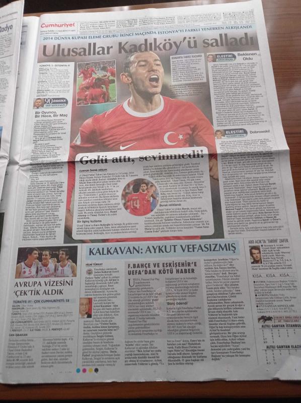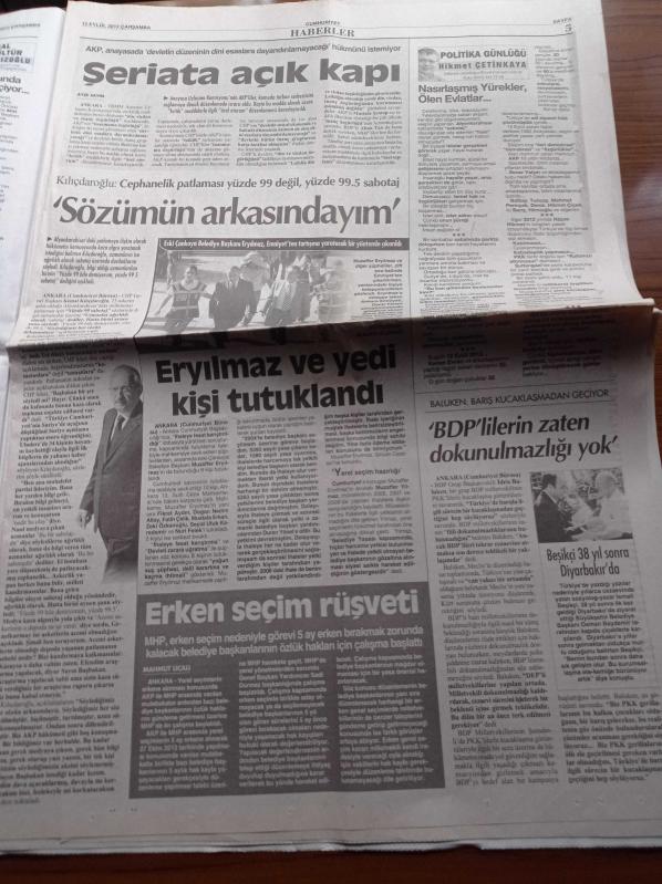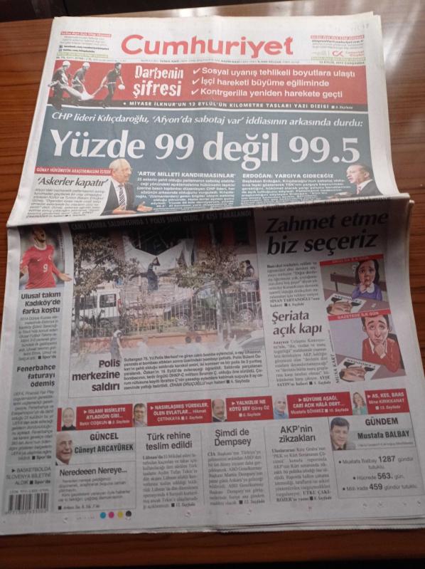 Cumhuriyet Gazetesi - 12 Eylül 2012 - Şadan Kalkavan Aykut Vefasızmış - Ulusal Milli Takım Kadıköy'ü Salladı - Cumhuriyet Halk Partisi Lideri Kemal Kılıçdaroğlu Afyon'da Sabotaj Var İddiasının Arkasında Durdu- Sultangazi'de Canlı Bomba Saldırısında 1 Polis Şehit Oldu - Recep Tayyip Erdoğan adlı eser Türkçe dilindedir.