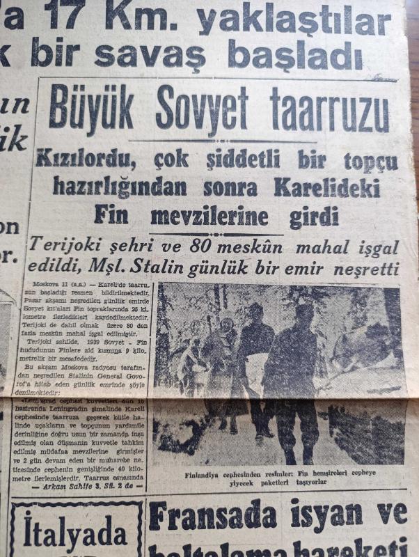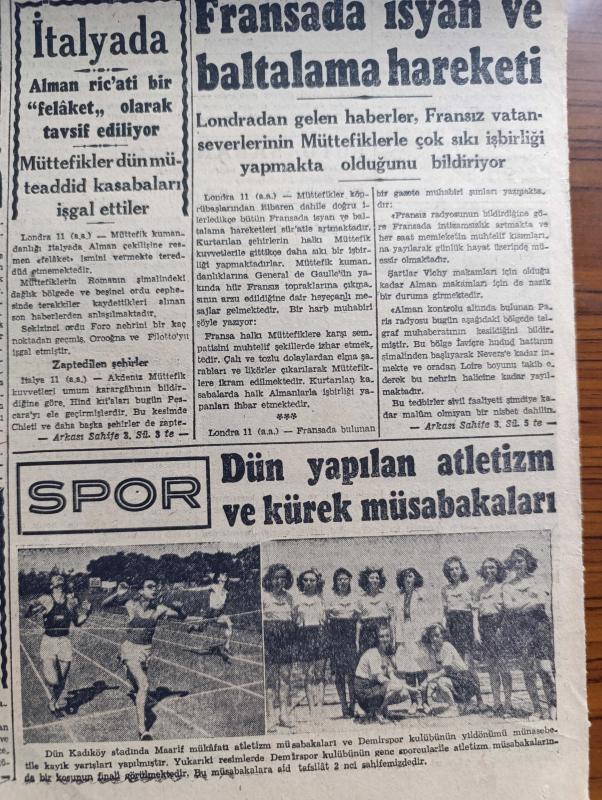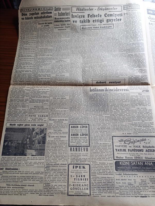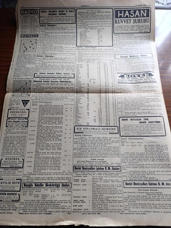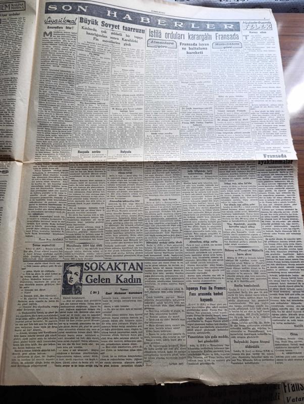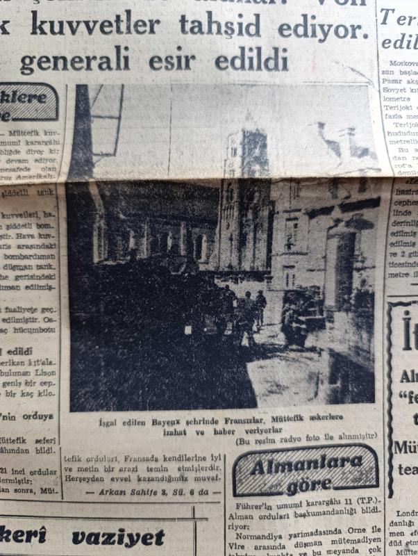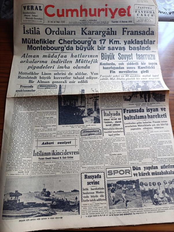 Cumhuriyet Gazetesi - 12 Haziran 1944 - Fransa'da ayaklanmalar yazan Nadir Nadi Başmakale - istila orduları karargaha Fransa'da - müttefikler Cherbourg'a 17 Km. yaklaştılar Montebourg'da Büyük bir savaş başladı - Alman müdafaa hatlarının arkalarına indirilen müttefik piyadeleri imha olundu - büyük Sovyet taarruzu - Finlandiya cephesinden fotoğraflar - Dün yapılan atletizm ve kürek müsabakaları - Askeri Vaziyet Yazan Emekli General H. Emir Erkilet Yazı Dizisi - Ankara'da dün yapılan at yarışları - Demirspor kulübünü yıldönümü - Taksim belediye Gazinosu yazlık pavyon açıldı- Sokaktan Gelen Kadın Yazan Esat Mahmut Karakurt Yazı dizisi - İsviçre felsefe cemiyeti ve takip ettiği gayeler yazan profesör Ziyaeddin Fahri Fındıkoğlu - Kurnaz adam yazan Burhan Felek - Almanların aldığı esirler - marsilya'da 1694 kişi öldü - De Gaulle Amerika'ya çağrıldı - Hasan kuvvet şurubu - Tablet Boyer ağrı kesici - bugünkü radyo programı - Bulmaca - Sadi Tek Tiyatrosu kuyruklu yıldız - Mareşal Stalin adlı eser, Kitap > Süreli Yayınlar > Gazeteler > Türkiye > Genel > Günlük kategorisinde İkinci El olarak satıştadır.