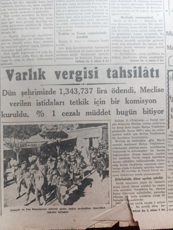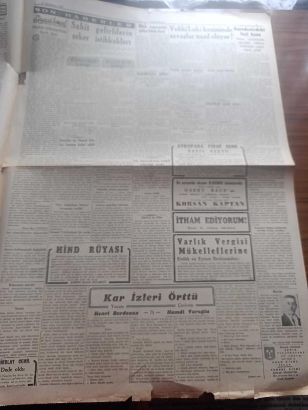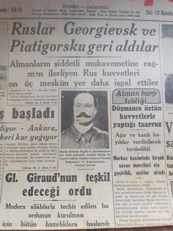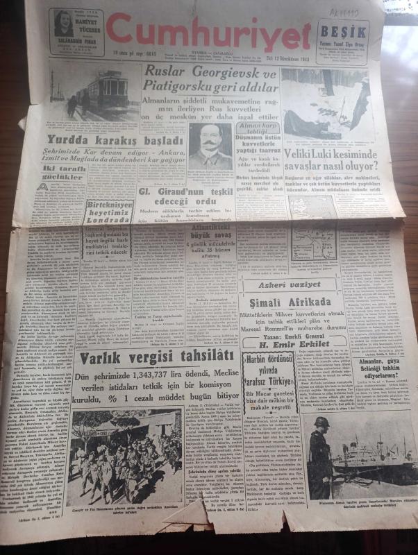Cumhuriyet Gazetesi - 12 İkincikanun (Ocak) 1943 - İki taraflı güçlükler Cumhuriyet başmakale - yurtta karakış başladı fotoğraf - Ruslar Georgievsk Ve Piatigorsku geri aldılar - Veliki Luiki mevsiminde savaşlar nasıl oluyor - şark cephesinden fotoğraflar - Alman harp tebliği düşmanın Üstün kuvvetlerle yaptığı taarruz ağır ve Kanlı kayıplar verdirilerek tardedildi - general Giraud'un teşkil edeceği Ordu - atlantik'teki büyük savaş - Varlık vergisi tahsilatı dün İstanbul'da 1.343.737 lira ödendi - Harbin dördüncü yılında tarafsız Türkiye - Askeri Vaziyet Yazan Emekli General H. Emir Erkilet Yazı Dizisi - Fransa'nın Alman işgaline geçen limanlarında makineli muhafız birlikleri fotoğraf - Kahire sokaklarında filmi Çemberlitaş sinemasında - kanlı meydan filmi yalnız İpek sinemasında - beni tarih kitapları müsabakası - haftanın muayen günlerinde halka balık verilecek - kar izleri örttü yazan Henri Bordeaux Yazı Dizisi - korsan Kaptan filmi Perşembe akşamı elhamra sinemasında - altın 31 lira, Yunus Nadi tarafından kaleme alınmıştır. Cumhuriyet Gazetesi - 12 İkincikanun (Ocak) 1943 - İki taraflı güçlükler Cumhuriyet başmakale - yurtta karakış başladı fotoğraf - Ruslar Georgievsk Ve Piatigorsku geri aldılar - Veliki Luiki mevsiminde savaşlar nasıl oluyor - şark cephesinden fotoğraflar - Alman harp tebliği düşmanın Üstün kuvvetlerle yaptığı taarruz ağır ve Kanlı kayıplar verdirilerek tardedildi - general Giraud'un teşkil edeceği Ordu - atlantik'teki büyük savaş - Varlık vergisi tahsilatı dün İstanbul'da 1.343.737 lira ödendi - Harbin dördüncü yılında tarafsız Türkiye - Askeri Vaziyet Yazan Emekli General H. Emir Erkilet Yazı Dizisi - Fransa'nın Alman işgaline geçen limanlarında makineli muhafız birlikleri fotoğraf - Kahire sokaklarında filmi Çemberlitaş sinemasında - kanlı meydan filmi yalnız İpek sinemasında - beni tarih kitapları müsabakası - haftanın muayen günlerinde halka balık verilecek - kar izleri örttü yazan Henri Bordeaux Yazı Dizisi - korsan Kaptan filmi Perşembe akşamı elhamra sinemasında - altın 31 lira adlı eser Türkçe dilindedir.