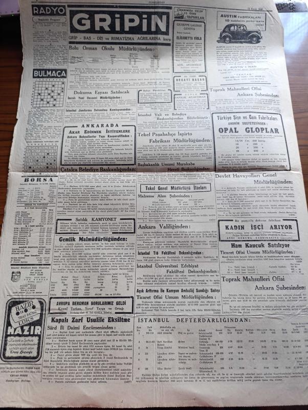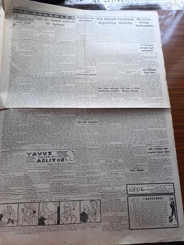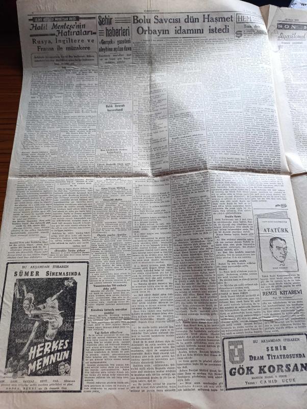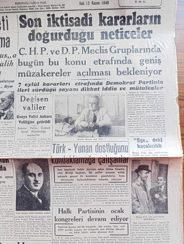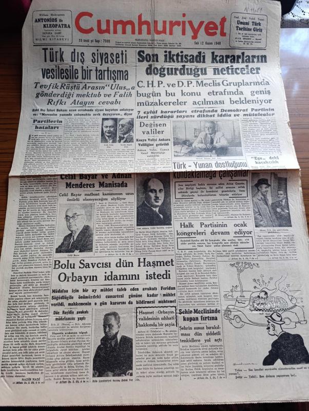 Cumhuriyet Gazetesi - 12 Kasım 1946 - partilerin hataları yazan Nadir Nadi Başmakale - Türk dış siyaseti vesilesi ile bir tartışma - Tevfik Rüştü Arasın Ulus gazetesine gönderdiği mektup ve Falih Rıfkı Atay'ın cevabı - son iktisadi kararların doğurduğu neticeler - Konya valisi İzzettin Çağpar Ankara valiliği'ne getirildi - Celal Bayar ve Adnan Menderes Manisa'da - Halk Partisi'nin Ocak kongreleri devam ediyor - Türk Yunan dostluğunu kundaklamaya çalışanlar - Bolu savcısı Zahid Tor dün Haşmet Orbay'ın idamını istedi - Devlet Deniz yolları umum müdürlüğü baş acentacısı İlhami Perk gazetecilerle görüşürken fotoğraf - Ticaret Bakanı Atıf İnan fotoğraf - Cemal Nadir karikatür - herkes memnun filmi Sümer sinemasında - Eski Meclisi mebusan Reisi Halil Menteşe'nin hatıraları yazı dizisi - Gök Korsan oyunu şehir dram tiyatrosunda - gerçek gazetesi aleyhine açılan dava - yunanistan'dan 700 muhacir daha geldi - Yavuz Sultan Selim Ağlıyor yazan Feridun Fazıl Tülbentçi yazı dizisi - radyo programı adlı eser, Kitap > Süreli Yayınlar > Gazeteler > Türkiye > Genel > Günlük kategorisinde İkinci El olarak satıştadır.