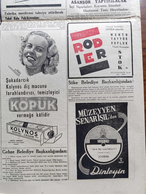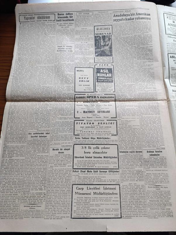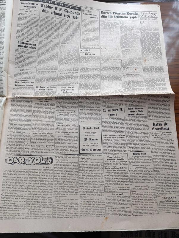 Cumhuriyet Gazetesi - 12 Kasım 1948 - 20 Yıl Sonra İlk Gensoru - Kabine Halk Partisi Grubunda Dün İtimad Reyi Aldı - Bütçe Komisyonu Mali Durumumuzu İnceliyor - Bütçe Komisyonu Katibi Fakihe Öymen Fotoğraf - Unesco Yönetim Kurulu Dün İlk İçtimaını Yaptı - Dolmuş Yapan Taksiler Dolmabahçe Yoluyla Beyoğlu'na Çıkacaklar - Arabaya Koşulan Vatandaşlar - Zengin Vatandaş Refik Hıfzı Büyükaslan Milyonluk Servetini Darülacezeye Bıraktı - Saint Helene'de ölen Napolyon'un Benzeri Mi İdi - Sultanahmet'te Yapılması Düşünülen Adliye Sarayı İnşaatından Vazgeçildi - Beşiktaş Beykoz Maçı - Dar Yol Yazan Peride Celal Yazı Dizisi - İngiliz Başbakanı Attlee Truman Ve Stalin Mülakatı Aleyhinde - Makineye Ne Hacet Yazan Burhan Felek Köşe Yazısı - Serenad Elhamra Sinemasında - Küçük Hikaye Yapraklar Dökülürken Yazan Cevad Tevfik Enson - Korkusuz Lassie Kadıköy Opera Sinemasında - Müzeyyen Senar Işıl'dan Sen Bu Yaylaları Şarkısını Dinleyin - Bugünkü Radyo Programı - İstanbul Belediyesi Şehir Tiyatroları, Yunus Nadi tarafından kaleme alınmıştır. Cumhuriyet Gazetesi - 12 Kasım 1948 - 20 Yıl Sonra İlk Gensoru - Kabine Halk Partisi Grubunda Dün İtimad Reyi Aldı - Bütçe Komisyonu Mali Durumumuzu İnceliyor - Bütçe Komisyonu Katibi Fakihe Öymen Fotoğraf - Unesco Yönetim Kurulu Dün İlk İçtimaını Yaptı - Dolmuş Yapan Taksiler Dolmabahçe Yoluyla Beyoğlu'na Çıkacaklar - Arabaya Koşulan Vatandaşlar - Zengin Vatandaş Refik Hıfzı Büyükaslan Milyonluk Servetini Darülacezeye Bıraktı - Saint Helene'de ölen Napolyon'un Benzeri Mi İdi - Sultanahmet'te Yapılması Düşünülen Adliye Sarayı İnşaatından Vazgeçildi - Beşiktaş Beykoz Maçı - Dar Yol Yazan Peride Celal Yazı Dizisi - İngiliz Başbakanı Attlee Truman Ve Stalin Mülakatı Aleyhinde - Makineye Ne Hacet Yazan Burhan Felek Köşe Yazısı - Serenad Elhamra Sinemasında - Küçük Hikaye Yapraklar Dökülürken Yazan Cevad Tevfik Enson - Korkusuz Lassie Kadıköy Opera Sinemasında - Müzeyyen Senar Işıl'dan Sen Bu Yaylaları Şarkısını Dinleyin - Bugünkü Radyo Programı - İstanbul Belediyesi Şehir Tiyatroları adlı eser Türkçe dilindedir.