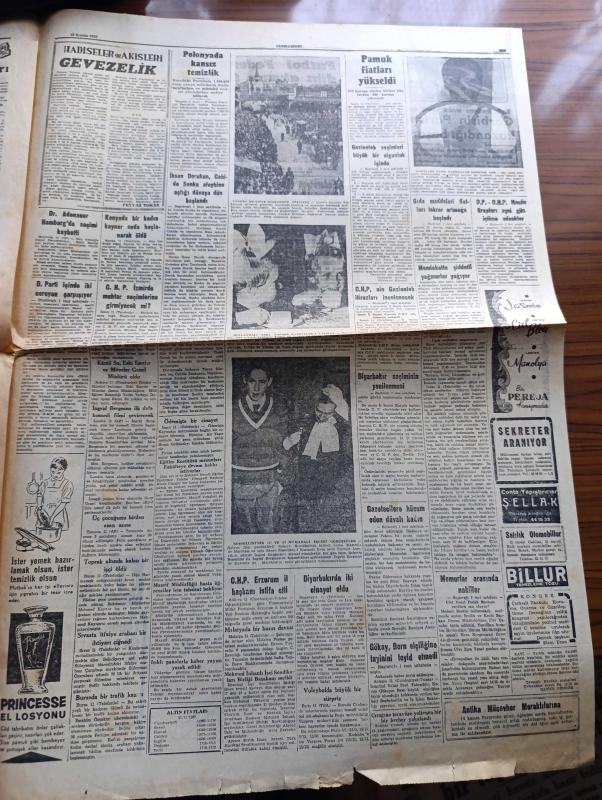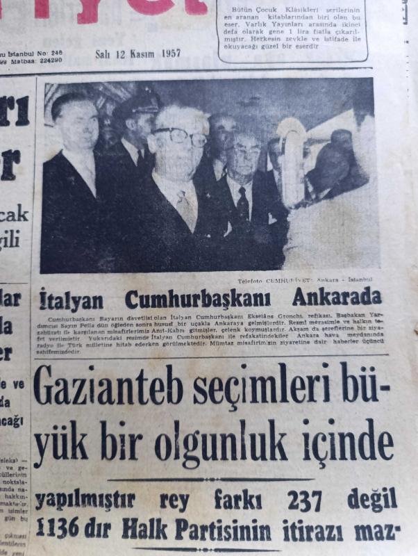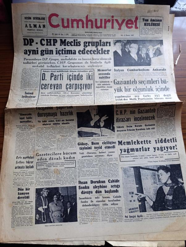 Cumhuriyet Gazetesi - 12 Kasım 1957 - Demokrat Parti CHP Meclis Grupları Aynı Gün İçtima Edecekler - İtalyan Cumhurbaşkanı Gioavanni Gronchi Ankara'da fotoğraf - İhsan Doruk'un Cahide Aleyhine Açtığı Davaya Dün Başlandı - Pul Sergisi Açıldı - İsmet İnönü İyileşiyor - Gaziantep seçimleri büyük bir olgunluk içinde yapılmıştır - Seni Sevmek Kaderdir Yazan Sinclair Levis - devrimizin sinirlilikleri yazan Profesör Doktor Rasim Adasal - gençlik tiyatrosunun temsilleri - Dünya Bankası Süveyş Kanalı İhtilafında Aracı - Elektrikli Balık - Yağlıboya Nasıl Kullanılır - iki denizaltımız Pakistan'a gitti - Ingrid Bergman İlk Defa Komedi Filmi Çevirecek - Galatasaray Dün On Kişi İle Antrenmanda fotoğraf - Federasyon Kupasına Yarın Dolmabahçe Devam Edilecek - Fenerbahçeli Ergun Öztuna İyileşiyor - Jozef Monel Öldü - Fahrettin Kerim Gökay Bern Elçiliğine Tayinini Teyid Etmedi - Kamil su eski eserler ve Müzeler Genel Müdürü oldu - Kula kumaşları - Ankara İstanbul radyosu programı adlı eser, Kitap > Süreli Yayınlar > Gazeteler > Türkiye > Genel > Günlük kategorisinde İkinci El olarak satıştadır.