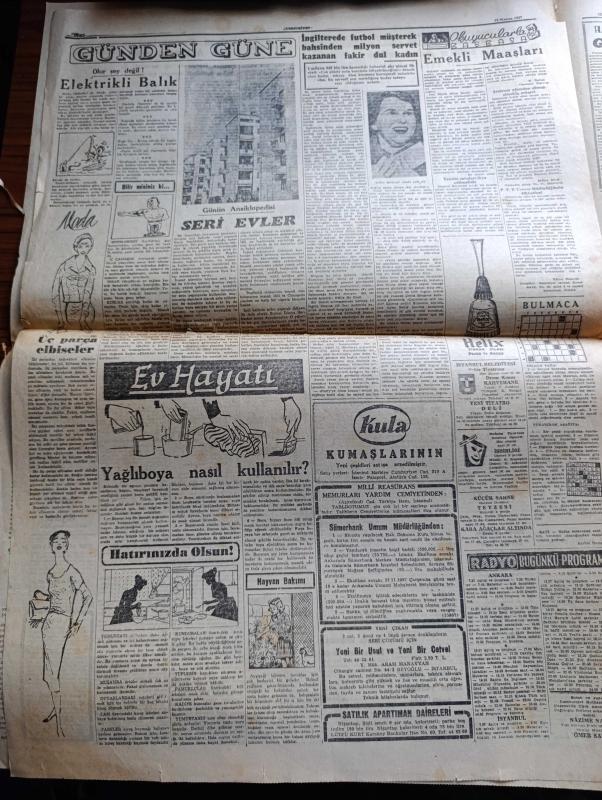 Cumhuriyet Gazetesi - 12 Kasım 1957 - Demokrat Parti CHP Meclis Grupları Aynı Gün İçtima Edecekler - İtalyan Cumhurbaşkanı Gioavanni Gronchi Ankara'da fotoğraf - İhsan Doruk'un Cahide Aleyhine Açtığı Davaya Dün Başlandı - Pul Sergisi Açıldı - İsmet İnönü İyileşiyor - Gaziantep seçimleri büyük bir olgunluk içinde yapılmıştır - Seni Sevmek Kaderdir Yazan Sinclair Levis - devrimizin sinirlilikleri yazan Profesör Doktor Rasim Adasal - gençlik tiyatrosunun temsilleri - Dünya Bankası Süveyş Kanalı İhtilafında Aracı - Elektrikli Balık - Yağlıboya Nasıl Kullanılır - iki denizaltımız Pakistan'a gitti - Ingrid Bergman İlk Defa Komedi Filmi Çevirecek - Galatasaray Dün On Kişi İle Antrenmanda fotoğraf - Federasyon Kupasına Yarın Dolmabahçe Devam Edilecek - Fenerbahçeli Ergun Öztuna İyileşiyor - Jozef Monel Öldü - Fahrettin Kerim Gökay Bern Elçiliğine Tayinini Teyid Etmedi - Kamil su eski eserler ve Müzeler Genel Müdürü oldu - Kula kumaşları - Ankara İstanbul radyosu programı, Yunus Nadi tarafından kaleme alınmıştır. Cumhuriyet Gazetesi - 12 Kasım 1957 - Demokrat Parti CHP Meclis Grupları Aynı Gün İçtima Edecekler - İtalyan Cumhurbaşkanı Gioavanni Gronchi Ankara'da fotoğraf - İhsan Doruk'un Cahide Aleyhine Açtığı Davaya Dün Başlandı - Pul Sergisi Açıldı - İsmet İnönü İyileşiyor - Gaziantep seçimleri büyük bir olgunluk içinde yapılmıştır - Seni Sevmek Kaderdir Yazan Sinclair Levis - devrimizin sinirlilikleri yazan Profesör Doktor Rasim Adasal - gençlik tiyatrosunun temsilleri - Dünya Bankası Süveyş Kanalı İhtilafında Aracı - Elektrikli Balık - Yağlıboya Nasıl Kullanılır - iki denizaltımız Pakistan'a gitti - Ingrid Bergman İlk Defa Komedi Filmi Çevirecek - Galatasaray Dün On Kişi İle Antrenmanda fotoğraf - Federasyon Kupasına Yarın Dolmabahçe Devam Edilecek - Fenerbahçeli Ergun Öztuna İyileşiyor - Jozef Monel Öldü - Fahrettin Kerim Gökay Bern Elçiliğine Tayinini Teyid Etmedi - Kamil su eski eserler ve Müzeler Genel Müdürü oldu - Kula kumaşları - Ankara İstanbul radyosu programı adlı eser Türkçe dilindedir.