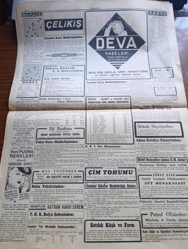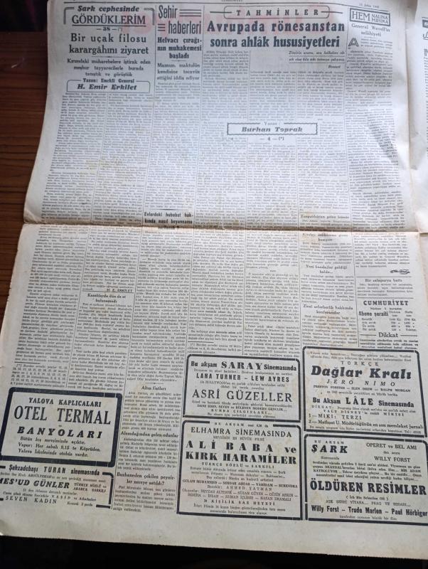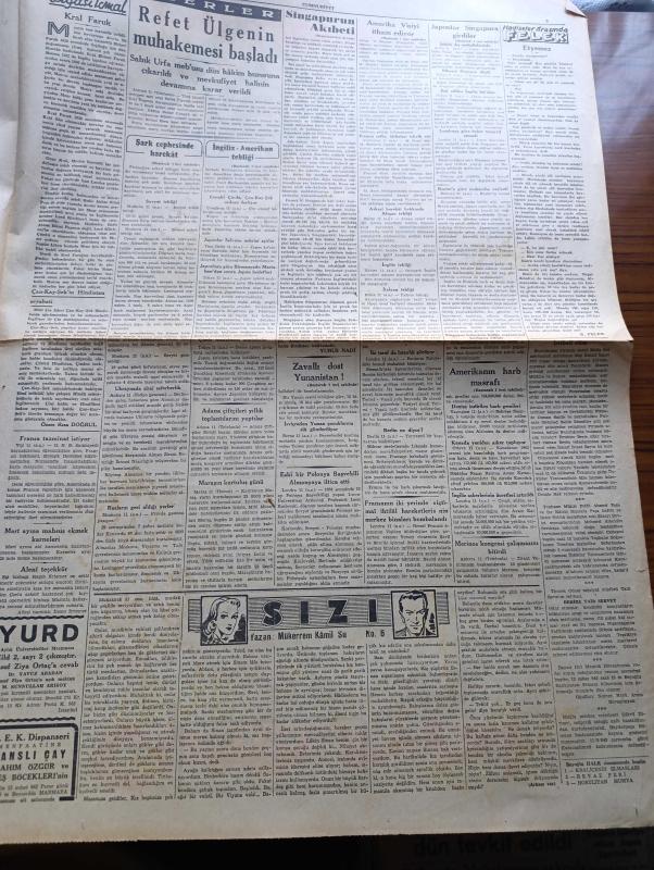 Cumhuriyet Gazetesi - 12 Şubat 1942 - Singapurun Akıbeti Yazan Yunus Nadi Köşe Yazısı - Ankara Tekzib Ediyor Perapalas Suikastine Dair Tahkikat Alman Ajanları Mesuliyetinin Sabit Olmadığına Bildiriliyor - Tanca Hadisesi Üzerine - Singapuru Bütün Tabii Arıza Ve Tesisat ile Gösterirler Kabartma Kroki - Japonlar Singapur'a Girdiler - Zavallı Dost Yunanistan - Amerika'nın Harp Masrafı Şimdiden 143 Milyar Doları Buldu - Şark Cephesinde Gördüklerim Yazan Emekli General H. Emir Erkilet Yazı Dizisi - Yalova Kaplıcaları Otel Termal Ve Banyoları - Mesud Günler Şehzadebaşı Turan Sinemasında - Dağlar Kralı Bu Akşam Lale Sinemasında - Avrupa'da Rönesanstan Sonra Ahlak Hususiyetleri Yazan Burhan Toprak - Sızı Yazan Mükerrem Kamil Su Yazı işleri - Etyemez Yazan Burhan Felek Köşe Yazısı - Sinir Kırıklık Ve Bütün Ağrılara Deva Kaşeleri - Bulmaca - Borsa- Şehir Tiyatrosu Temsilleri - Tepebaşı Dram Kısmında Rüzgar Esince - Komedi Kısmında Kiralık Odalar - Bugünkü Radyo Programı adlı eser, Kitap > Süreli Yayınlar > Gazeteler > Türkiye > Genel > Günlük kategorisinde İkinci El olarak satıştadır.