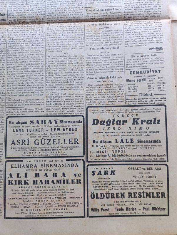 Cumhuriyet Gazetesi - 12 Şubat 1942 - Singapurun Akıbeti Yazan Yunus Nadi Köşe Yazısı - Ankara Tekzib Ediyor Perapalas Suikastine Dair Tahkikat Alman Ajanları Mesuliyetinin Sabit Olmadığına Bildiriliyor - Tanca Hadisesi Üzerine - Singapuru Bütün Tabii Arıza Ve Tesisat ile Gösterirler Kabartma Kroki - Japonlar Singapur'a Girdiler - Zavallı Dost Yunanistan - Amerika'nın Harp Masrafı Şimdiden 143 Milyar Doları Buldu - Şark Cephesinde Gördüklerim Yazan Emekli General H. Emir Erkilet Yazı Dizisi - Yalova Kaplıcaları Otel Termal Ve Banyoları - Mesud Günler Şehzadebaşı Turan Sinemasında - Dağlar Kralı Bu Akşam Lale Sinemasında - Avrupa'da Rönesanstan Sonra Ahlak Hususiyetleri Yazan Burhan Toprak - Sızı Yazan Mükerrem Kamil Su Yazı işleri - Etyemez Yazan Burhan Felek Köşe Yazısı - Sinir Kırıklık Ve Bütün Ağrılara Deva Kaşeleri - Bulmaca - Borsa- Şehir Tiyatrosu Temsilleri - Tepebaşı Dram Kısmında Rüzgar Esince - Komedi Kısmında Kiralık Odalar - Bugünkü Radyo Programı