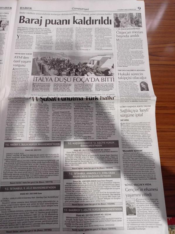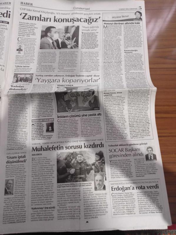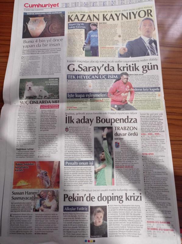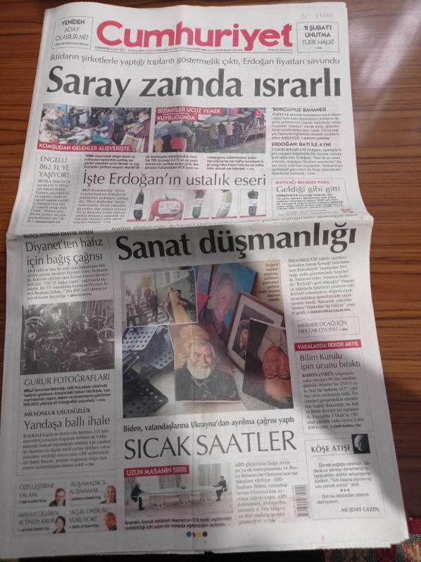 Cumhuriyet Gazetesi - 12 Şubat 2022 - Fenerbahçe'de Başkan Ali Koç'a Tepkiler Artıyor - Pekin'de Doping Krizi - Saray Zamda Israrlı - Diyanetten Hafız İçin Bağış Çağrısı - Koronavirüs Vakalarında Rekor Artış - Kültür Bakanlığı BASAD'daki Tarihi Eserleri Polis Eşliğinde Sokağa Attı - Tarık Akan - Recep Tayyip Erdoğan adlı eser Türkçe dilindedir.