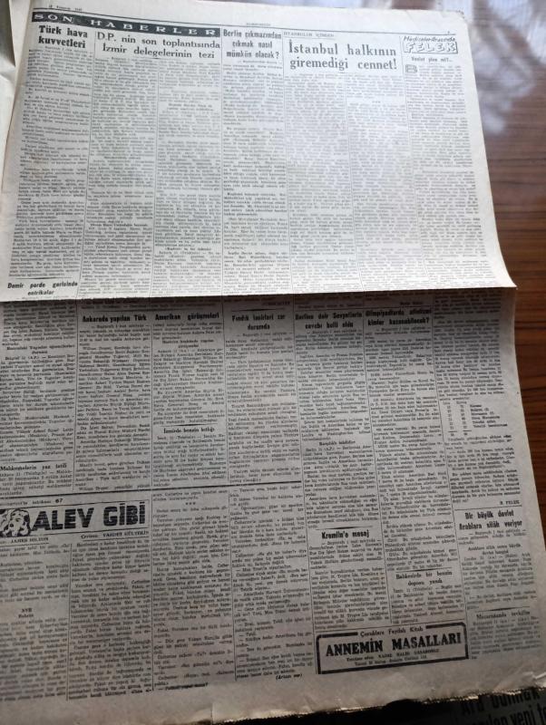 Cumhuriyet Gazetesi - 12 Temmuz 1948 - Berlin çıkmazından çıkmak nasıl mümkün olacak Cumhuriyet Başmakale - Demokrat Parti'nin son toplantısında İzmir delegelerinin terzi - Adnan Menderes Fuat Köprülü ve Fevzi Lütfi Karaosmanoğlu haklarında yapılan neşriyata cevap verdiler - Ankara'da yapılan Türk Amerikan görüşmelerine Amerika Büyükelçisi Wilson General Brid General Hoag Ve Amiral Settle katıldılar - Berline dair sovyetlerin cevabı belli oldu - bir büyük devlet Araplara silah veriyor - İtalyanlar Fenerbahçe'yi 2-1 yendiler fotoğraf - olimpiyatlarda atletizmi kimler kazanabilecek - Emirgan korusu'na halkın girmesi yasak - ölümünün yıl dönümünde Mimar Kemalettin'i anarken yazan yüksek Mimar Sedat Çetintaş - vuslat yine mi yaza Burhan Felek - geçen yıla ait keşifler yazan Rıdvan Tezel - gazetecilik okulu yazan profesör Hasan Refik Ertuğ - Zehra Bilir Perihan Altındağ Sözeri ve Müzeyyen Senar Işıl Yenikapı M. Çakır Gazinosunda - bugünkü radyo programı - Odeon yeni çıkan plaklar adlı eser, Kitap > Süreli Yayınlar > Gazeteler > Türkiye > Genel > Günlük kategorisinde İkinci El olarak satıştadır.
