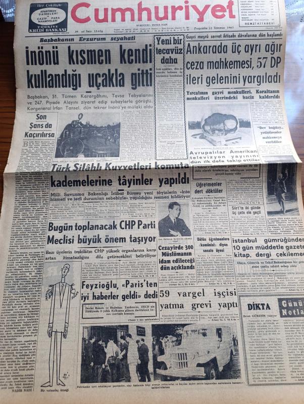 Cumhuriyet Gazetesi - 12 Temmuz 1962 - Nadir Nadi Köşe Yazısı - Başbakan İsmet İnönü Erzurum'a Kısmen Kendi Kullandığı Uçakla Gitti - Türk Silahlı Kuvvetleri Komuta Kademelerine Tayinler Yapıldı - Ankara'da Üç Ayrı Ağır Ceza Mahkemesi 57 Demokrat Parti İleri Gelenini Yargıladı - Avrupalılar Amerikan Televizyon Yayınını Dün İlk Defa Takip Ettiler - Bütün Öğretmenlere Komünist Diyen Senatör Ömer Lütfü Bozcalı - Cezayir'de 300 Müslümanın İdam Edileceği Açıklandı - İlhan Selçuk Köşe Yazısı - Gecenin Ucundaki Işık Yazan Peride Celal Yazı Dizisi - İstanbul Üniversitesi Nasıl Açılmıştı Yazan Emin Ali Çavlı - İspanya Diktatörü Franco Halefini Tayin Etti - Uzun Ömürlü Bir Bahçe Çiçeği Floks Yazan Mevlüt Baysal - Bay Oscar Karikatür - Resimli Roman Melun Kız Çizen Yves Sayol Yazı Dizisi - Fenerbahçeli Kaleci Özcan Şengül'ün Gün Geçtikçe Fiyatı Düşüyor - İsrailli Atletler Bugün Geliyor - Fenerbahçe Atletizm Pisti Tamamlanıyor - Galatasaray Metin Oktay Meselesini Halledecek - Atlet Gürkan Çevik, Yunus Nadi tarafından kaleme alınmıştır. Cumhuriyet Gazetesi - 12 Temmuz 1962 - Nadir Nadi Köşe Yazısı - Başbakan İsmet İnönü Erzurum'a Kısmen Kendi Kullandığı Uçakla Gitti - Türk Silahlı Kuvvetleri Komuta Kademelerine Tayinler Yapıldı - Ankara'da Üç Ayrı Ağır Ceza Mahkemesi 57 Demokrat Parti İleri Gelenini Yargıladı - Avrupalılar Amerikan Televizyon Yayınını Dün İlk Defa Takip Ettiler - Bütün Öğretmenlere Komünist Diyen Senatör Ömer Lütfü Bozcalı - Cezayir'de 300 Müslümanın İdam Edileceği Açıklandı - İlhan Selçuk Köşe Yazısı - Gecenin Ucundaki Işık Yazan Peride Celal Yazı Dizisi - İstanbul Üniversitesi Nasıl Açılmıştı Yazan Emin Ali Çavlı - İspanya Diktatörü Franco Halefini Tayin Etti - Uzun Ömürlü Bir Bahçe Çiçeği Floks Yazan Mevlüt Baysal - Bay Oscar Karikatür - Resimli Roman Melun Kız Çizen Yves Sayol Yazı Dizisi - Fenerbahçeli Kaleci Özcan Şengül'ün Gün Geçtikçe Fiyatı Düşüyor - İsrailli Atletler Bugün Geliyor - Fenerbahçe Atletizm Pisti Tamamlanıyor - Galatasaray Metin Oktay Meselesini Halledecek - Atlet Gürkan Çevik adlı eser Türkçe dilindedir.