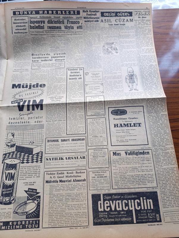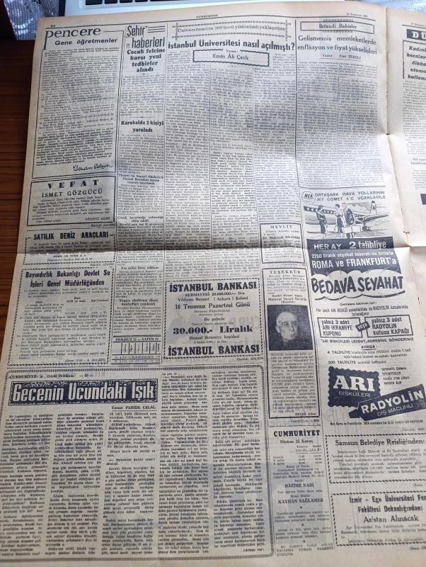 Cumhuriyet Gazetesi - 12 Temmuz 1962 - Nadir Nadi Köşe Yazısı - Başbakan İsmet İnönü Erzurum'a Kısmen Kendi Kullandığı Uçakla Gitti - Türk Silahlı Kuvvetleri Komuta Kademelerine Tayinler Yapıldı - Ankara'da Üç Ayrı Ağır Ceza Mahkemesi 57 Demokrat Parti İleri Gelenini Yargıladı - Avrupalılar Amerikan Televizyon Yayınını Dün İlk Defa Takip Ettiler - Bütün Öğretmenlere Komünist Diyen Senatör Ömer Lütfü Bozcalı - Cezayir'de 300 Müslümanın İdam Edileceği Açıklandı - İlhan Selçuk Köşe Yazısı - Gecenin Ucundaki Işık Yazan Peride Celal Yazı Dizisi - İstanbul Üniversitesi Nasıl Açılmıştı Yazan Emin Ali Çavlı - İspanya Diktatörü Franco Halefini Tayin Etti - Uzun Ömürlü Bir Bahçe Çiçeği Floks Yazan Mevlüt Baysal - Bay Oscar Karikatür - Resimli Roman Melun Kız Çizen Yves Sayol Yazı Dizisi - Fenerbahçeli Kaleci Özcan Şengül'ün Gün Geçtikçe Fiyatı Düşüyor - İsrailli Atletler Bugün Geliyor - Fenerbahçe Atletizm Pisti Tamamlanıyor - Galatasaray Metin Oktay Meselesini Halledecek - Atlet Gürkan Çevik adlı eser, Kitap > Süreli Yayınlar > Gazeteler > Türkiye > Genel > Günlük kategorisinde İkinci El olarak satıştadır.