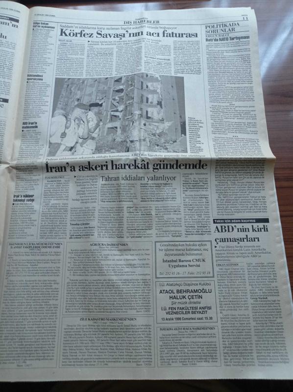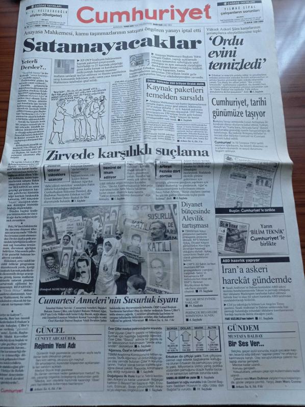 Cumhuriyet Gazetesi - 13 Aralık 1996 - Tribün Anarşisi Yaratan Fişlenecek - Efes Pilsen - Anayasa Mahkemesi Kamu Taşınmazlarının Satışını Öngören Yasayı İptal Etti - Cumartesi Anneleri'nin Susurluk İsyanı - Ordu Evini Temizledi - Zirvede Karşılıklı Suçlama - Mehmet Ağar - Süleyman Demirel - Diyanet Bütçesinde Alevilik Tartışması adlı eser Türkçe dilindedir.