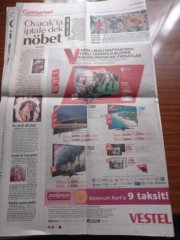 Sayfa Boyutu: 38*56cm Sayfa Sayısı: 18 Cumhuriyet Gazetesi Yıpranma, sararmalar, kupon kesiği ve yırtılmalar zamana bağlı olarak görülebilir