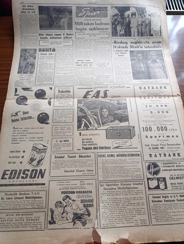 Cumhuriyet Gazetesi - 13 Ekim 1961 - İsmet İnönü'nün Dün Yaptığı Konuşmanın Tam Metni - Dün Taksim'de 100,000 Den Fazla Vatandaş Vardı - İstanbullu İsmet İnönü'yü Yağmur Altında Dinledi - Ekrem Alican Politika Cambazlarına Şiddetle Çattı - Ragıp Gümüşpala Kayserilileri Kızdırdı - NATO Mali Heyetine Durumumuz Bütün Açıklığı İle Anlatılacak - Yüksek Adalet Divanı Duruşma Öncesi Çalışmalarına Başladı - Çaresaz Yazan Halide Edip Adıvar Yazı Dizisi - Amerikan Başkanı Kennedy'nin Dünkü Basın Toplantısı - Irak Petrol Şirketleriyle Yaptığı Müzakereleri Kesti - X 15 Roket Uçağı Fezada Yeni Bir Rekor Kırdı - Bay Oscar Karikatür - Profesör Nimbüs'ün Maceraları Çizgi Roman - Nerede Pazar Orada Particiler Yazan Yaşar Kemal - Yurtta Seçim Mücadelesi İntibaları - Van'da Aşiret Oylarının Seçimde Büyük Rolü Olacak - Resimli Roman Bankerin Milyonları Çizen Yves Sayol - Güney Kore'ye Karşı Çıkacak Milli Takım Kadrosu Bugün Açıklanıyor - Galatasaray Kadro Dışı Oyunculardan Bir Takım Kurdu, Yunus Nadi tarafından kaleme alınmıştır. Cumhuriyet Gazetesi - 13 Ekim 1961 - İsmet İnönü'nün Dün Yaptığı Konuşmanın Tam Metni - Dün Taksim'de 100,000 Den Fazla Vatandaş Vardı - İstanbullu İsmet İnönü'yü Yağmur Altında Dinledi - Ekrem Alican Politika Cambazlarına Şiddetle Çattı - Ragıp Gümüşpala Kayserilileri Kızdırdı - NATO Mali Heyetine Durumumuz Bütün Açıklığı İle Anlatılacak - Yüksek Adalet Divanı Duruşma Öncesi Çalışmalarına Başladı - Çaresaz Yazan Halide Edip Adıvar Yazı Dizisi - Amerikan Başkanı Kennedy'nin Dünkü Basın Toplantısı - Irak Petrol Şirketleriyle Yaptığı Müzakereleri Kesti - X 15 Roket Uçağı Fezada Yeni Bir Rekor Kırdı - Bay Oscar Karikatür - Profesör Nimbüs'ün Maceraları Çizgi Roman - Nerede Pazar Orada Particiler Yazan Yaşar Kemal - Yurtta Seçim Mücadelesi İntibaları - Van'da Aşiret Oylarının Seçimde Büyük Rolü Olacak - Resimli Roman Bankerin Milyonları Çizen Yves Sayol - Güney Kore'ye Karşı Çıkacak Milli Takım Kadrosu Bugün Açıklanıyor - Galatasaray Kadro Dışı Oyunculardan Bir Takım Kurdu adlı eser Türkçe dilindedir.
