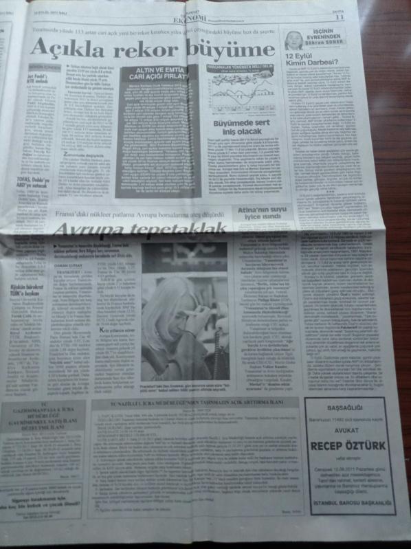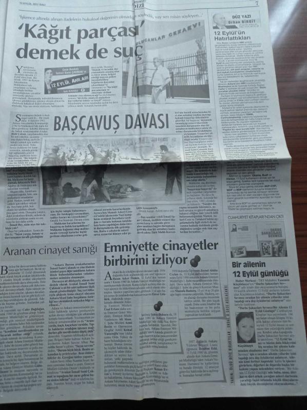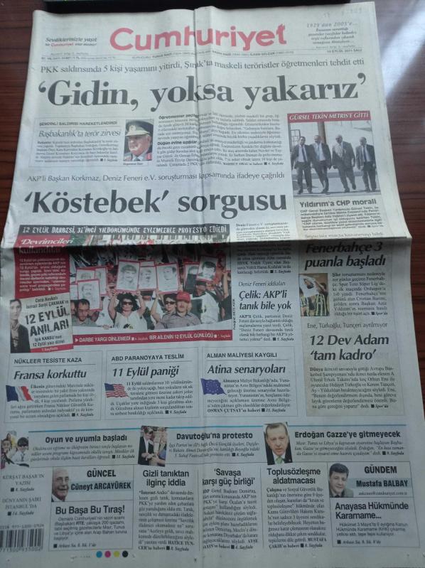 Cumhuriyet Gazetesi - 13 Eylül 2011 - Güreşte İlk Madalya Cenk İldem'in - Futbolda Şike Soruşturmaları - Ceza Avukatı İsmail Sami Çakmak'ın 12 Eylül Anıları Yazı Dizisi - PKK Saldırısında 5 Kişi Yaşamını Yitirdi - Öğretmenlere Tehdit - Şemdinli Saldırısı - Gürsel Tekin Metris'e Aziz Yıldırım'ı Ziyarete Gitti - Deniz Fenerinde Köstebek Sorgusu - Recep Tayyip Erdoğan Gazze'ye Gitmeyecek adlı eser Türkçe dilindedir.