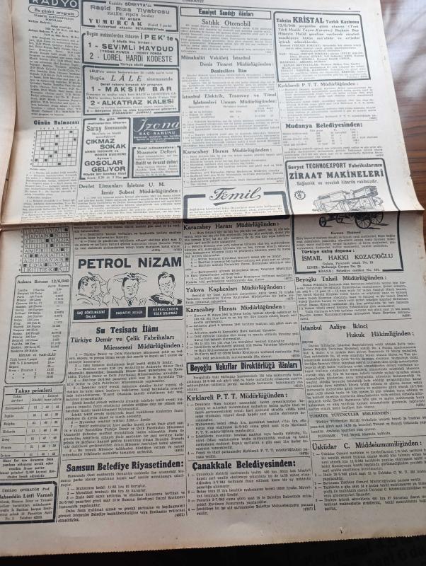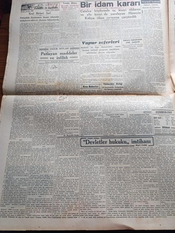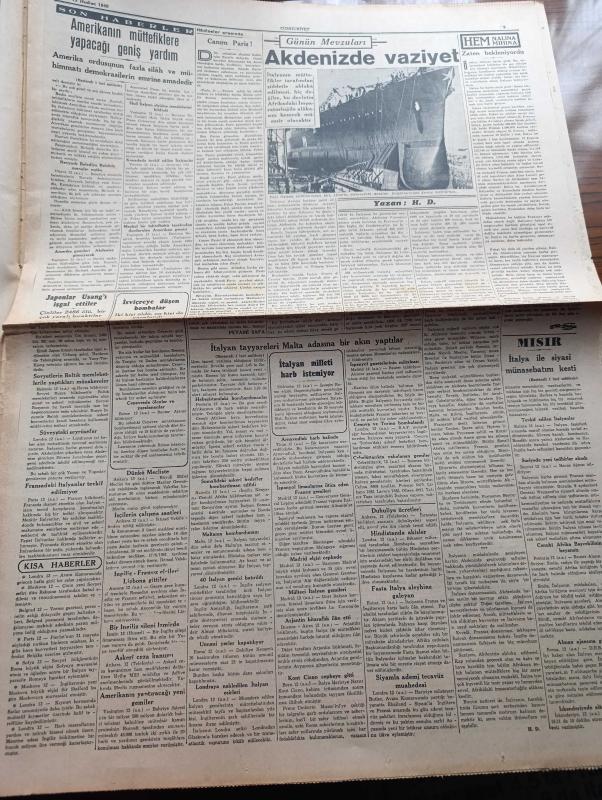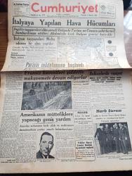 Cumhuriyet Gazetesi - 13 Haziran 1940 - İtalyan Müdahalesinden Sonra Vaziyet Yazan Nadir Nadi Köşe Yazısı - İtalya'ya Yapılan Hava Hücumları - İngiliz Tayyareleri Dün Şimali İtalya'da Torino Ve Genova Şehirlerini Bombardıman Ettiler - İtalyan Tayyareleri Malta Adasına Bir Akın Yaptılar - Paris'in Müdafaasına Başlandı - Amerika'nın Müttefiklere Yapacağı Geniş Yardım - Akdeniz'in Umumi Vaziyetini Gösteren Harita - Türkler Ve İngilizler Yazan Ziya Şakir Yazı Dizisi - Küçük Hikaye Devletler Hukuku İmtihanı Yazan Nuri Refik - Japonlar Uşang'ı İşgal Ettiler - Mısır İtalya İle Siyasi Münasebatını Kesti - Aşk Ve Macera Romanı İlk Ve Son Yazan Esat Mahmut Karakurt Yazı Dizisi - Bu Hafta Yapılacak Milli Küme Maçları - İngiltere Harp Kupası Finali Oynandı - Fenerbahçe Vefa Maçını Nuri Bosut İdare Edecek - Lorel Hardi Kodeste Bugün Lale Sinemasında - Büyük Kovboy Filmi Goşolar Geliyor Bugün Saray Sinemasında - Alkatraz Kalesi Bugün Lale Sinemasında - Petrol Nizam - Gelincik Sigarası Çıktı adlı eser, Kitap > Süreli Yayınlar > Gazeteler > Türkiye > Genel > Günlük kategorisinde İkinci El olarak satıştadır.