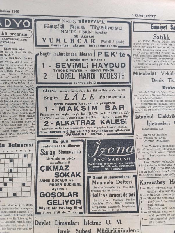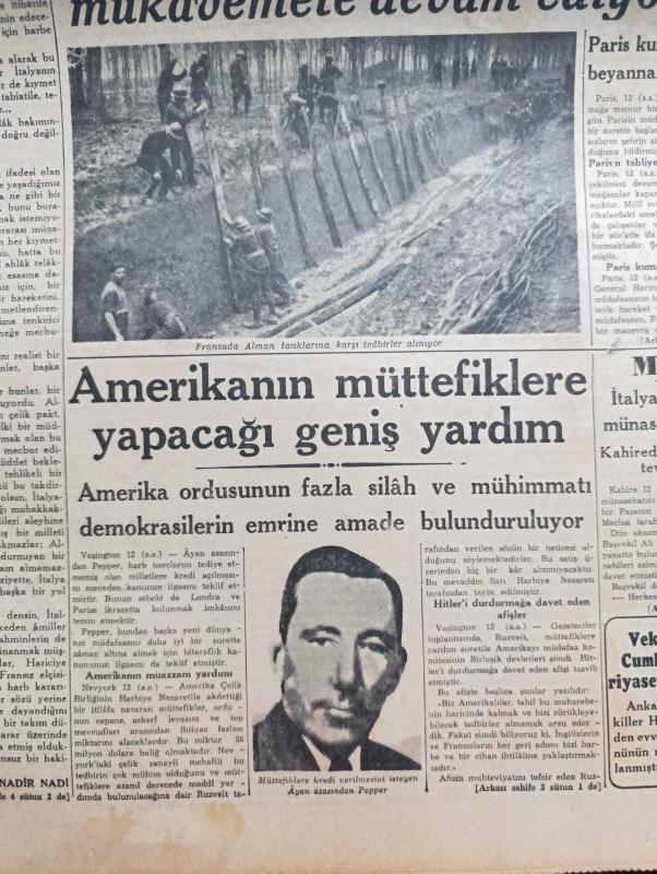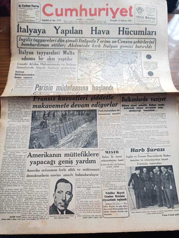 Cumhuriyet Gazetesi - 13 Haziran 1940 - İtalyan Müdahalesinden Sonra Vaziyet Yazan Nadir Nadi Köşe Yazısı - İtalya'ya Yapılan Hava Hücumları - İngiliz Tayyareleri Dün Şimali İtalya'da Torino Ve Genova Şehirlerini Bombardıman Ettiler - İtalyan Tayyareleri Malta Adasına Bir Akın Yaptılar - Paris'in Müdafaasına Başlandı - Amerika'nın Müttefiklere Yapacağı Geniş Yardım - Akdeniz'in Umumi Vaziyetini Gösteren Harita - Türkler Ve İngilizler Yazan Ziya Şakir Yazı Dizisi - Küçük Hikaye Devletler Hukuku İmtihanı Yazan Nuri Refik - Japonlar Uşang'ı İşgal Ettiler - Mısır İtalya İle Siyasi Münasebatını Kesti - Aşk Ve Macera Romanı İlk Ve Son Yazan Esat Mahmut Karakurt Yazı Dizisi - Bu Hafta Yapılacak Milli Küme Maçları - İngiltere Harp Kupası Finali Oynandı - Fenerbahçe Vefa Maçını Nuri Bosut İdare Edecek - Lorel Hardi Kodeste Bugün Lale Sinemasında - Büyük Kovboy Filmi Goşolar Geliyor Bugün Saray Sinemasında - Alkatraz Kalesi Bugün Lale Sinemasında - Petrol Nizam - Gelincik Sigarası Çıktı, Yunus Nadi tarafından kaleme alınmıştır. Cumhuriyet Gazetesi - 13 Haziran 1940 - İtalyan Müdahalesinden Sonra Vaziyet Yazan Nadir Nadi Köşe Yazısı - İtalya'ya Yapılan Hava Hücumları - İngiliz Tayyareleri Dün Şimali İtalya'da Torino Ve Genova Şehirlerini Bombardıman Ettiler - İtalyan Tayyareleri Malta Adasına Bir Akın Yaptılar - Paris'in Müdafaasına Başlandı - Amerika'nın Müttefiklere Yapacağı Geniş Yardım - Akdeniz'in Umumi Vaziyetini Gösteren Harita - Türkler Ve İngilizler Yazan Ziya Şakir Yazı Dizisi - Küçük Hikaye Devletler Hukuku İmtihanı Yazan Nuri Refik - Japonlar Uşang'ı İşgal Ettiler - Mısır İtalya İle Siyasi Münasebatını Kesti - Aşk Ve Macera Romanı İlk Ve Son Yazan Esat Mahmut Karakurt Yazı Dizisi - Bu Hafta Yapılacak Milli Küme Maçları - İngiltere Harp Kupası Finali Oynandı - Fenerbahçe Vefa Maçını Nuri Bosut İdare Edecek - Lorel Hardi Kodeste Bugün Lale Sinemasında - Büyük Kovboy Filmi Goşolar Geliyor Bugün Saray Sinemasında - Alkatraz Kalesi Bugün Lale Sinemasında - Petrol Nizam - Gelincik Sigarası Çıktı adlı eser Türkçe dilindedir.