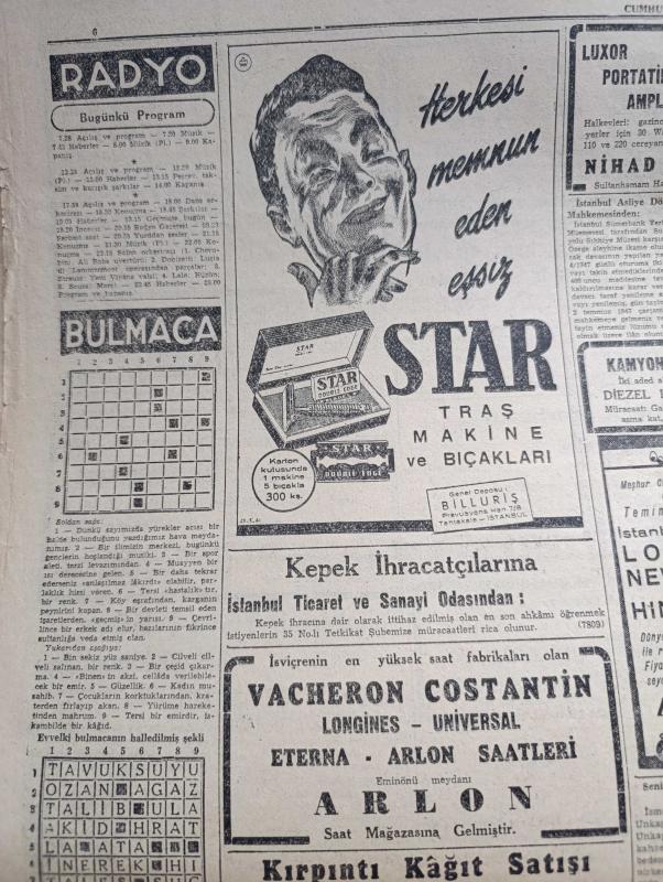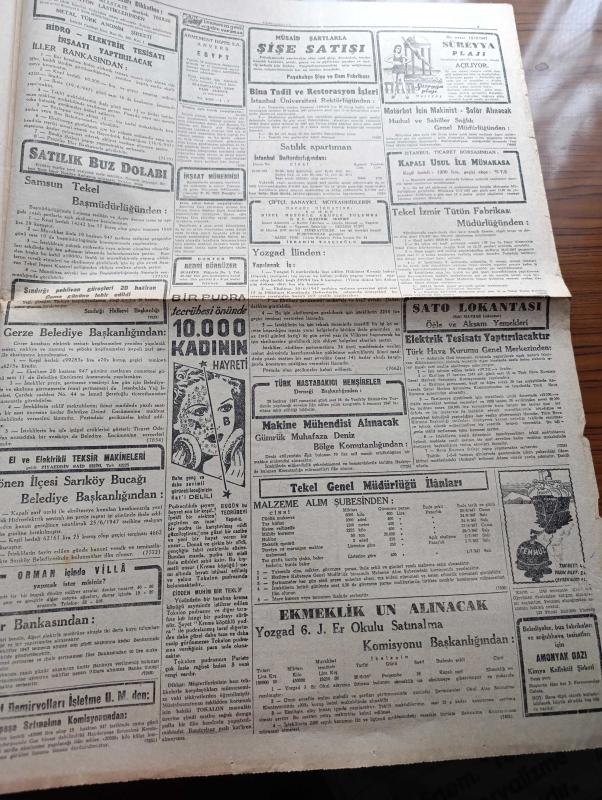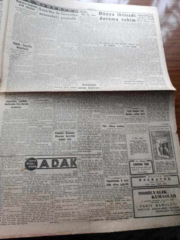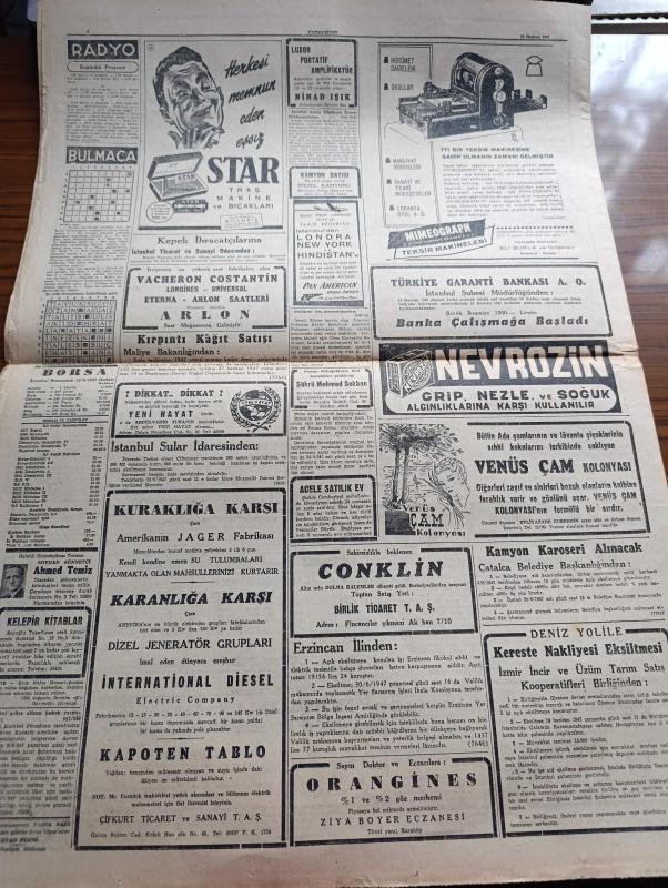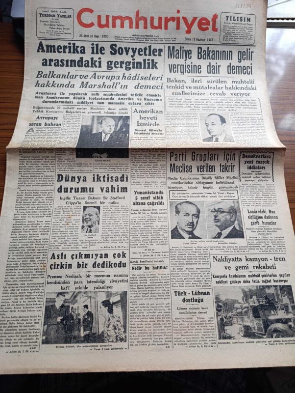 Cumhuriyet Gazetesi - 13 Haziran 1947 - Avrupa'yı Saran Buhran Köşe Yazısı - Amerika İle Sovyetler Arasındaki Gerginlik - Maliye Bakanı Halid Nazmi Keşmir'in Gelir Vergisine Dair Demeci - Amerikan Heyeti İzmir'de - Dünya İktisadi Durumu Vahim - Nakliyatta Kamyon Tren Ve Gemi Rekabeti - Prenses Neslişah Hakkında Aslı Çıkmayan Çok Çirkin Bir Dedikodu - Yunanistan'da 5 Sınıf Silah Altına Çağırıldı - 16. Asırda İstanbul'da Bir Musikili Temsil Yazan Refik Ahmed Sevengil - Necip Fazıl Kısakürek'in Büyük Doğu Gazetesi 4 Ay Kapatıldı - Leopold Levy'nin Sergisi Yazan Fikret Adil - Adak Yazan Kemal Ragıp Yazı Dizisi - Amerika'nın Yardımı Hakkında Pravda'nın Saçmaları - Mesken Buhranına Karşı Yazan Burhan Felek Köşe Yazısı - Ankara Yedinci Hafta Koşularının Tahminleri Yazan Reşad Kuran - Süreyya Plajı Açılıyor - Şato Lokantası - Star Traş Bıçağı - Bugünkü Radyo Programı - Mimeograph Teksir Makineleri - Venüs Çam Kolonyası - Arlon Saat Mağazaları - Doktor Şükrü Mehmed Sekban adlı eser, Kitap > Süreli Yayınlar > Gazeteler > Türkiye > Genel > Günlük kategorisinde İkinci El olarak satıştadır.