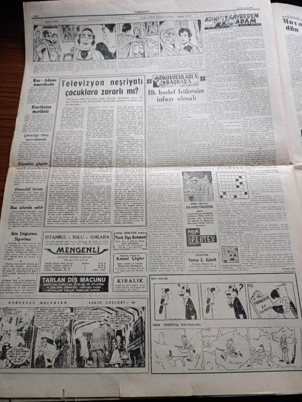 Cumhuriyet Gazetesi - 13 Haziran 1960 - Muvakkat Anayasa Dün Gece Açıklandı - Anayasa 4 Bölüm Ve 27 Maddeden Müteşekkil - Milli Birlik Komitesi Üyeleri - Devlet Vekili Amil Artus - Sille Barajı Çok Sade Merasimle Dün açıldı - Anayasaya İthali İstenen Basınla İlgili Hükümler - Üniversite Bugün Yeniden Açılıyor - Bütün Sabıklar Mal Beyanına Tabi Olacak - Sabık Devirde Dış Memleketlerde Bulunan Talebeye Yapılan Baskı - Fenerbahçe Galip Beşiktaş'ın Şampiyon - Yıldızlar Mahallesinde Komiserdim Beverly Hills Yazan Clinton Anderson Yazı Dizisi - Dümensiz Gemi Yazan Rikkat Köknar Yazı Dizisi - Lübnan'da Parlamento Seçimleri Dün Başladı - Suriye'de Petrol Bulundu - Kral Zago Hatıratını Bitiriyor - Koruyucu Melekler Aşkın Gözleri Çizgi Roman - Resimli Roman Başkasının Günahı Çizen Yves Sayol - Televizyon Neşriyatı Çocuklara Zararlı Mı - Bulmaca - Adını Kaybeden Adam Çeviren Hatice Vildan Yazı Dizisi - Bay Oscar Karikatür - Profesör Nimbüs'ün Maceraları Çizgi Roman - Fikret Kırcan, Yunus Nadi tarafından kaleme alınmıştır. Cumhuriyet Gazetesi - 13 Haziran 1960 - Muvakkat Anayasa Dün Gece Açıklandı - Anayasa 4 Bölüm Ve 27 Maddeden Müteşekkil - Milli Birlik Komitesi Üyeleri - Devlet Vekili Amil Artus - Sille Barajı Çok Sade Merasimle Dün açıldı - Anayasaya İthali İstenen Basınla İlgili Hükümler - Üniversite Bugün Yeniden Açılıyor - Bütün Sabıklar Mal Beyanına Tabi Olacak - Sabık Devirde Dış Memleketlerde Bulunan Talebeye Yapılan Baskı - Fenerbahçe Galip Beşiktaş'ın Şampiyon - Yıldızlar Mahallesinde Komiserdim Beverly Hills Yazan Clinton Anderson Yazı Dizisi - Dümensiz Gemi Yazan Rikkat Köknar Yazı Dizisi - Lübnan'da Parlamento Seçimleri Dün Başladı - Suriye'de Petrol Bulundu - Kral Zago Hatıratını Bitiriyor - Koruyucu Melekler Aşkın Gözleri Çizgi Roman - Resimli Roman Başkasının Günahı Çizen Yves Sayol - Televizyon Neşriyatı Çocuklara Zararlı Mı - Bulmaca - Adını Kaybeden Adam Çeviren Hatice Vildan Yazı Dizisi - Bay Oscar Karikatür - Profesör Nimbüs'ün Maceraları Çizgi Roman - Fikret Kırcan adlı eser Türkçe dilindedir.