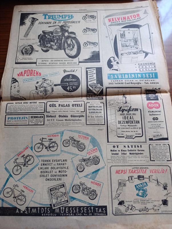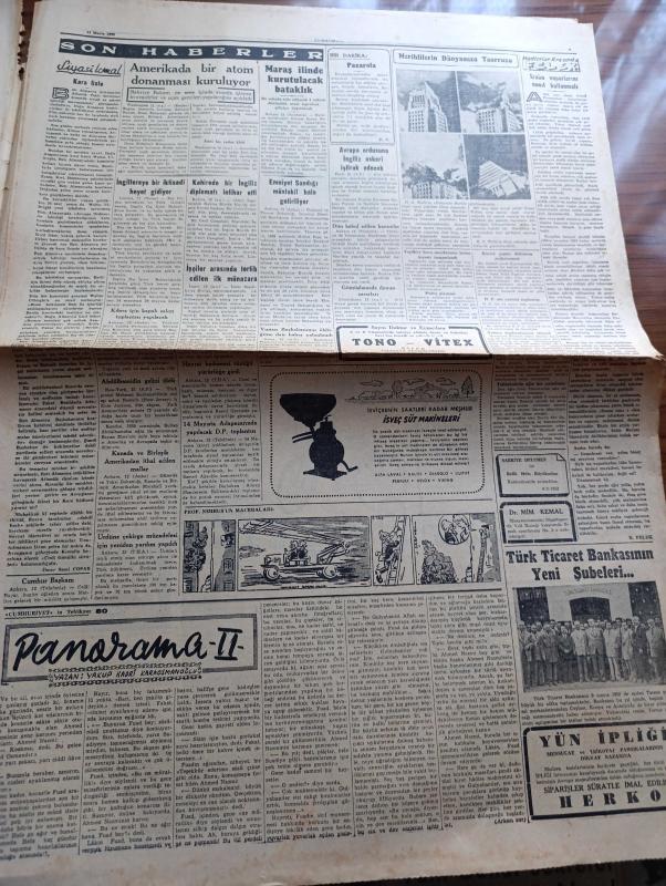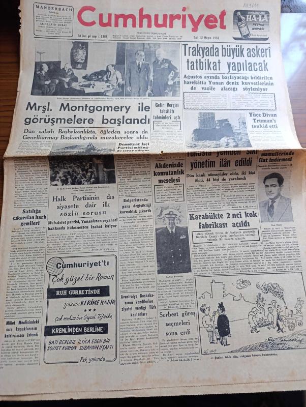 Cumhuriyet Gazetesi - 13 Mayıs 1952 - Mareşal Montgomery İle Görüşmelere Başlandı - Solda Mareşal Montgomery Başbakan Adnan Menderes Ve Genelkurmay Başkanı Fotoğraf - Trakya'da Büyük Askeri Tatbikat Yapılacak - Satılığa Çıkarılan Harp Gemileri - Halk Partisinin Dış Siyasete Dair İlk Sözlü Sorusu - Tunusta Yeniden Sıkı Yönetim İlan Edildi - Yüce Divan Truman'ı Tenkid Etti - Bir Beyaz Gömleklinin Dramı Yazan Doktor Burhan Öncel Yazı Dizisi - Şişli Kasımpaşa Arasında Troleybüs İşletilecek - Panaroma Yazan Yakup Kadri Karaosmanoğlu Yazı Dizisi - Araba Vapurlarını Nasıl Kullanmalı Yazan Burhan Felek - Avrupa Ordusuna İngiliz Askerî İştirak Edecek - Yunan Milli Takımıyla Yapacağımız Maç - Selimiye Kışlasında Dün Yapılan Tören - Trıumph Dünyanın En İyi Motosikleti - Sahibinin Sesi Buzdolabı - Vaporeks Tazyikli Otomatik Tencere - Victoria Bisiklet - Gaziantep Gül Palas Oteli adlı eser, Kitap > Süreli Yayınlar > Gazeteler > Türkiye > Genel > Günlük kategorisinde İkinci El olarak satıştadır.