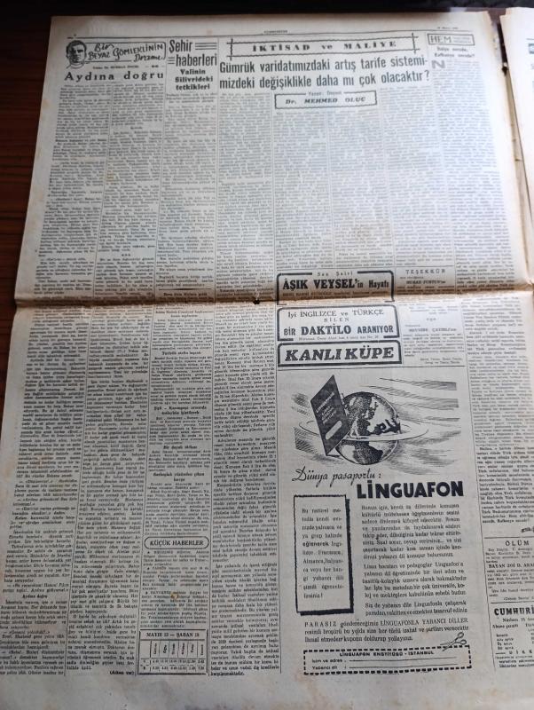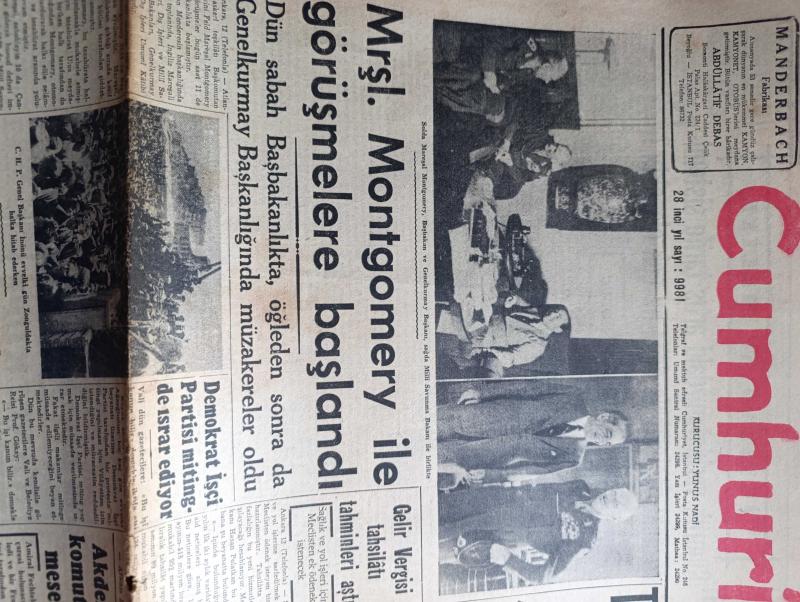 Cumhuriyet Gazetesi - 13 Mayıs 1952 - Mareşal Montgomery İle Görüşmelere Başlandı - Solda Mareşal Montgomery Başbakan Adnan Menderes Ve Genelkurmay Başkanı Fotoğraf - Trakya'da Büyük Askeri Tatbikat Yapılacak - Satılığa Çıkarılan Harp Gemileri - Halk Partisinin Dış Siyasete Dair İlk Sözlü Sorusu - Tunusta Yeniden Sıkı Yönetim İlan Edildi - Yüce Divan Truman'ı Tenkid Etti - Bir Beyaz Gömleklinin Dramı Yazan Doktor Burhan Öncel Yazı Dizisi - Şişli Kasımpaşa Arasında Troleybüs İşletilecek - Panaroma Yazan Yakup Kadri Karaosmanoğlu Yazı Dizisi - Araba Vapurlarını Nasıl Kullanmalı Yazan Burhan Felek - Avrupa Ordusuna İngiliz Askerî İştirak Edecek - Yunan Milli Takımıyla Yapacağımız Maç - Selimiye Kışlasında Dün Yapılan Tören - Trıumph Dünyanın En İyi Motosikleti - Sahibinin Sesi Buzdolabı - Vaporeks Tazyikli Otomatik Tencere - Victoria Bisiklet - Gaziantep Gül Palas Oteli, Yunus Nadi tarafından kaleme alınmıştır. Cumhuriyet Gazetesi - 13 Mayıs 1952 - Mareşal Montgomery İle Görüşmelere Başlandı - Solda Mareşal Montgomery Başbakan Adnan Menderes Ve Genelkurmay Başkanı Fotoğraf - Trakya'da Büyük Askeri Tatbikat Yapılacak - Satılığa Çıkarılan Harp Gemileri - Halk Partisinin Dış Siyasete Dair İlk Sözlü Sorusu - Tunusta Yeniden Sıkı Yönetim İlan Edildi - Yüce Divan Truman'ı Tenkid Etti - Bir Beyaz Gömleklinin Dramı Yazan Doktor Burhan Öncel Yazı Dizisi - Şişli Kasımpaşa Arasında Troleybüs İşletilecek - Panaroma Yazan Yakup Kadri Karaosmanoğlu Yazı Dizisi - Araba Vapurlarını Nasıl Kullanmalı Yazan Burhan Felek - Avrupa Ordusuna İngiliz Askerî İştirak Edecek - Yunan Milli Takımıyla Yapacağımız Maç - Selimiye Kışlasında Dün Yapılan Tören - Trıumph Dünyanın En İyi Motosikleti - Sahibinin Sesi Buzdolabı - Vaporeks Tazyikli Otomatik Tencere - Victoria Bisiklet - Gaziantep Gül Palas Oteli adlı eser Türkçe dilindedir.