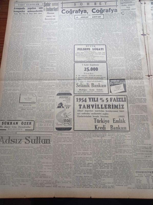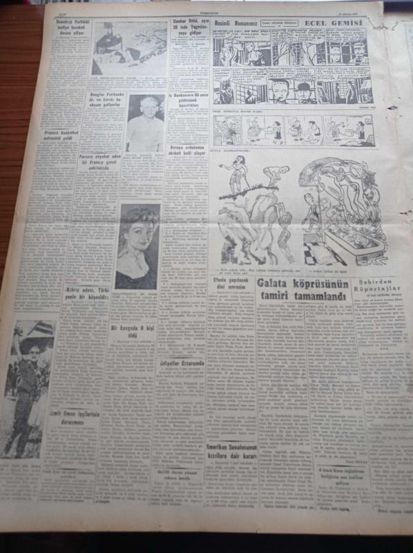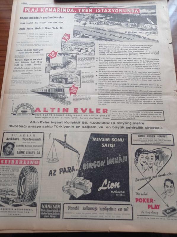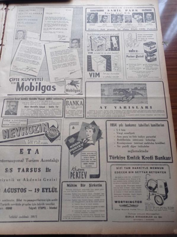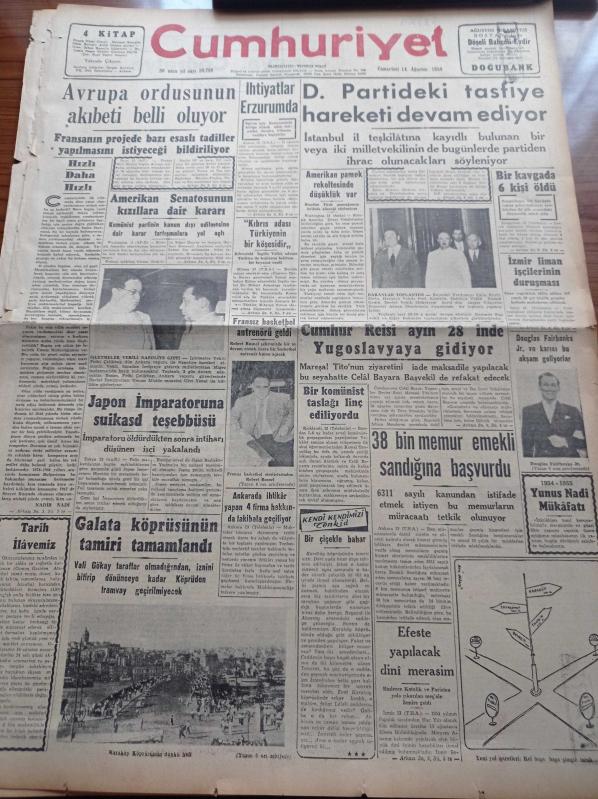 Cumhuriyet Gazetesi - 14 Ağustos 1954 - Avrupa Ordusunun Akıbeti Belli Oluyor - Demokrat Partideki Tasfiye Hareketi Devam Ediyor - Cumhurreisi Celal Bayar Ayın 28'inde Yugoslavya'ya Gidiyor - Amerikan Senatosunun Kızıllara Dair Kararı - Galata Köprüsünün Tamiri Tamamlandı - Japon İmparatoru Hirohito'ya Suikast Teşebbüsü - Portekizle Hindistan Arasındaki Gerginlik - Güreşçi Celal Atiğin Kahvesinde Bir Adam Öldürüldü - Film Yıldızı Neriman Köksal Puro Tuvalet Sabunları Kullanıyorum Diyor - Yunus Nadi Mükâfatı - İstanbul Enternasyonal Tenis Turnuvası - İstanbul'un Kok Kömür İhtiyacı Temin Edildi - Napoleon'un Piç Olduğu İddiası Fransa'da Hararetli Tartışmalara Yol Açıyor - Resimli Romanımız Ecel Gemisi - Hollywood'un En Güzel Kızı Dolores Dorn - Çifte Kuvvetli Yeni Mobilgas - Hamiyet Yüceses - İsmail Dümbüllü - Sabite Tur Gülerman - At Yarışları - Krem Pertev - Altın Evler - Sadeddin Kaynak Jubilesinde Saime Sinan'ı Da Dinleyeceksiniz - Lion Mağazası, Yunus Nadi tarafından kaleme alınmıştır. Cumhuriyet Gazetesi - 14 Ağustos 1954 - Avrupa Ordusunun Akıbeti Belli Oluyor - Demokrat Partideki Tasfiye Hareketi Devam Ediyor - Cumhurreisi Celal Bayar Ayın 28'inde Yugoslavya'ya Gidiyor - Amerikan Senatosunun Kızıllara Dair Kararı - Galata Köprüsünün Tamiri Tamamlandı - Japon İmparatoru Hirohito'ya Suikast Teşebbüsü - Portekizle Hindistan Arasındaki Gerginlik - Güreşçi Celal Atiğin Kahvesinde Bir Adam Öldürüldü - Film Yıldızı Neriman Köksal Puro Tuvalet Sabunları Kullanıyorum Diyor - Yunus Nadi Mükâfatı - İstanbul Enternasyonal Tenis Turnuvası - İstanbul'un Kok Kömür İhtiyacı Temin Edildi - Napoleon'un Piç Olduğu İddiası Fransa'da Hararetli Tartışmalara Yol Açıyor - Resimli Romanımız Ecel Gemisi - Hollywood'un En Güzel Kızı Dolores Dorn - Çifte Kuvvetli Yeni Mobilgas - Hamiyet Yüceses - İsmail Dümbüllü - Sabite Tur Gülerman - At Yarışları - Krem Pertev - Altın Evler - Sadeddin Kaynak Jubilesinde Saime Sinan'ı Da Dinleyeceksiniz - Lion Mağazası adlı eser Türkçe dilindedir.